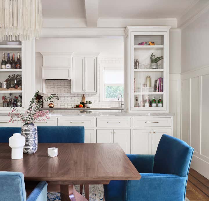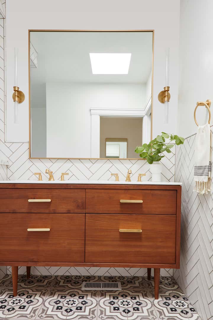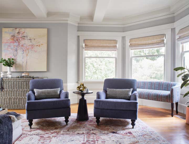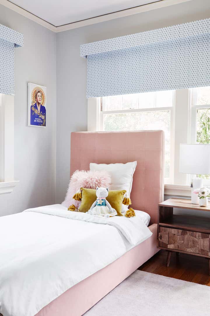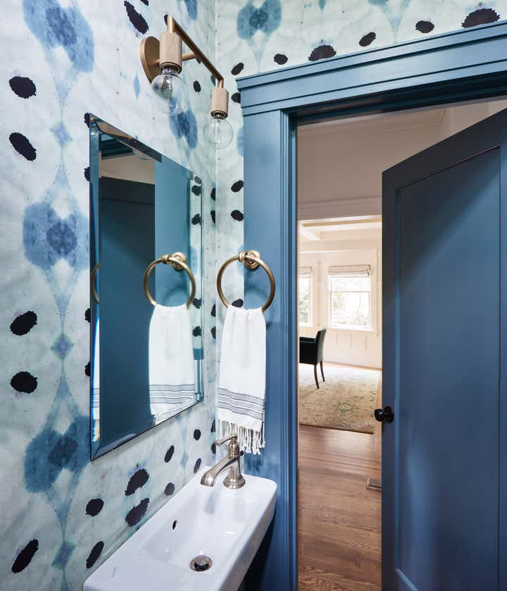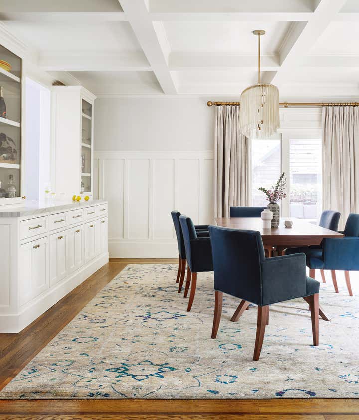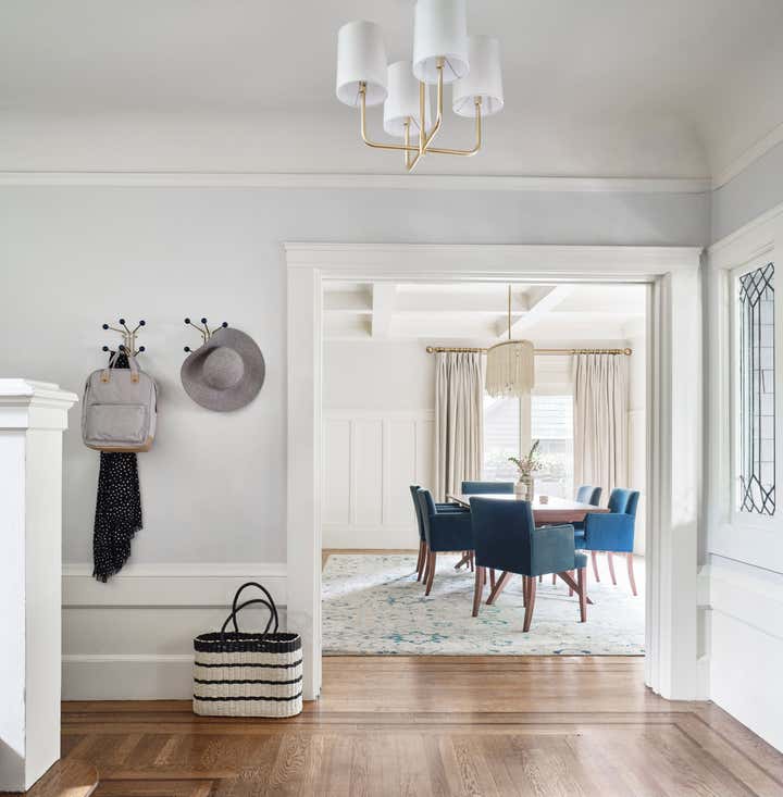 We worked hard to honor the vintage details of this 1910 three-story Craftsman home including large windows, box ceilings, wainscotting, and a dramatic staircase, while also making the home work for this modern family. Updates included creating a pass-through between the kitchen and dining room thus making the space feel more expansive while also honoring the ceiling detail. In the bathrooms, we embraced vibrant patterns and colors. When sourcing furniture we balanced function with form, favoring durable materials that could stand up to the rigors of young children.