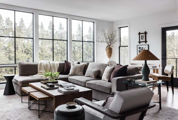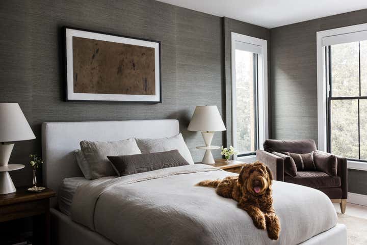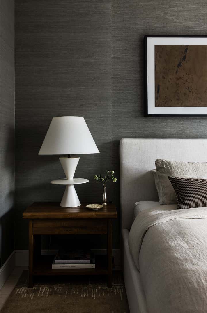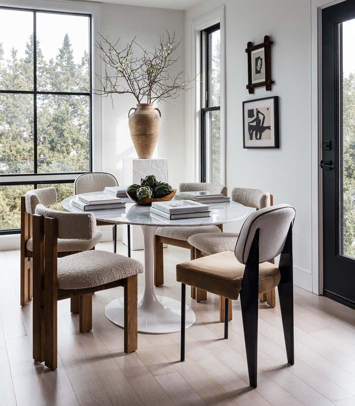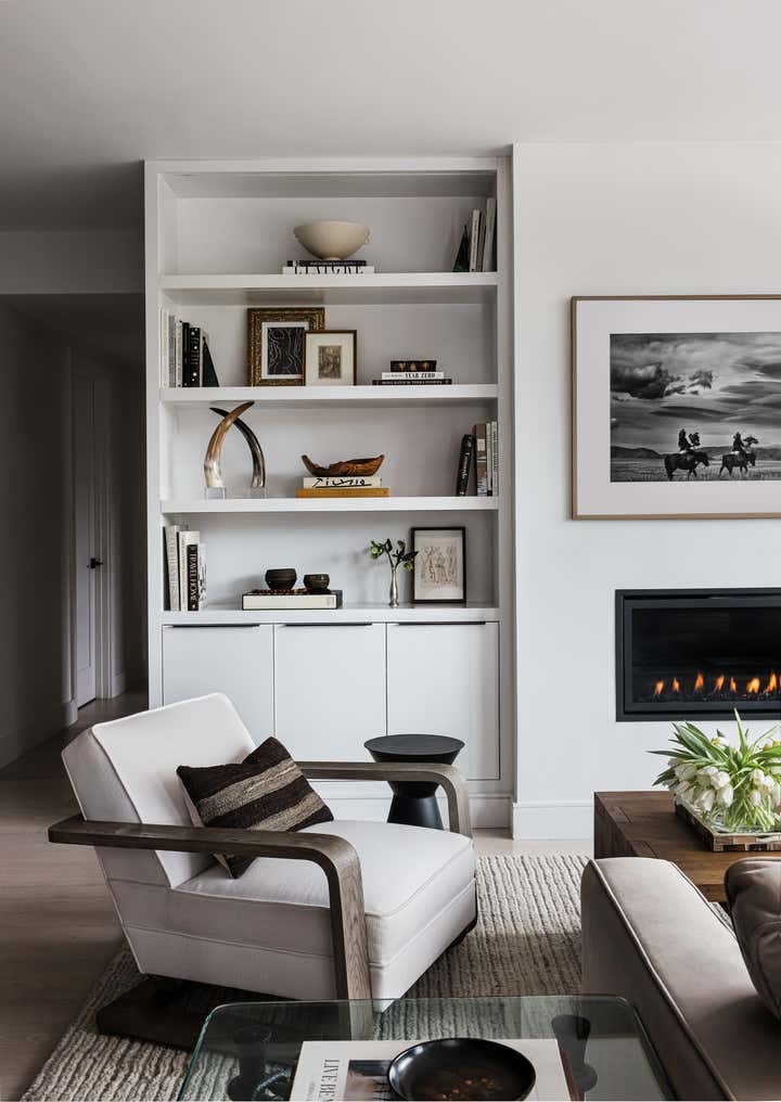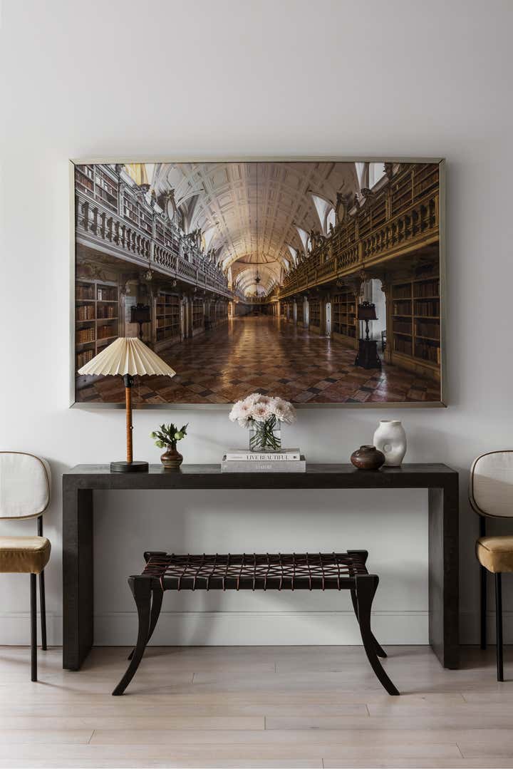This is a two bedroom new construction condo in the Jeffries Point area of Boston. We began working on it when it was still in the development phase, selecting the Kitchen stone and Pendants, as well as the Primary Bath tile. As the rest of the the unit was a blank slate, we focused heavily on curating furniture, rugs, decor, art and accessories - the goal was to create a space that felt layered and textural, and as if it had been collected over the span of many years. We leaned heavily into sourcing vintage and antique pieces for art and accessories - the patina of one-of-a-kind pieces against the white walls and black mullioned windows created somewhat of a gallery-effect here, while still feeling lived-in. We designed custom built-bookshelves to anchor the fireplace in the living room, and added a slate-colored grasscloth to the walls of the Primary Suite, which transformed that room into an enveloping, moody, retreat.