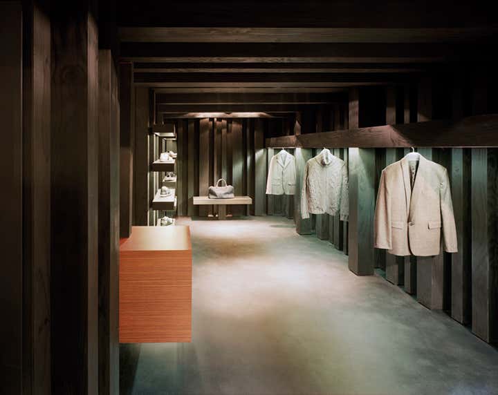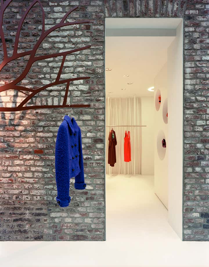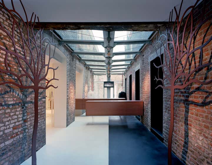 Labels in Sittard offers an impressive collection of fashion brands. The existing shop soon proved to be too small, and was extended with the addition of a neighbouring premises. The long, narrow garden in between the buildings was given a glass roof. By breaking through windows and doors in the side walls, three interconnected spaces were created with seven passageways. Mentjens created a division between the women’s and men’s sections precisely in the middle of the central glass-roofed space, starting with the floor. One half of the floor is pure white, the other jet black: colours representing yin and yang, the feminine and the masculine. Elegant versus rugged, like the intangible, graceful world of Venus and the earthy, black smithy of Vulcan, her husband, in Roman mythology. The connection between the spaces is made by two sales counters, half protruding into the glass-roofed space and half into the white or black areas. More text on our website.