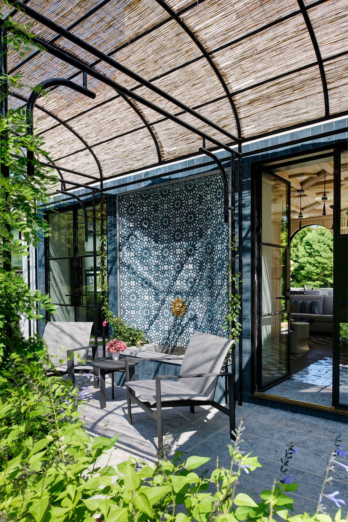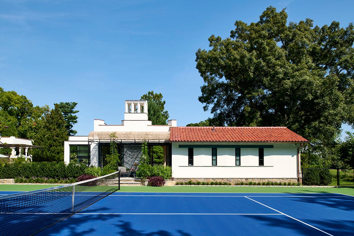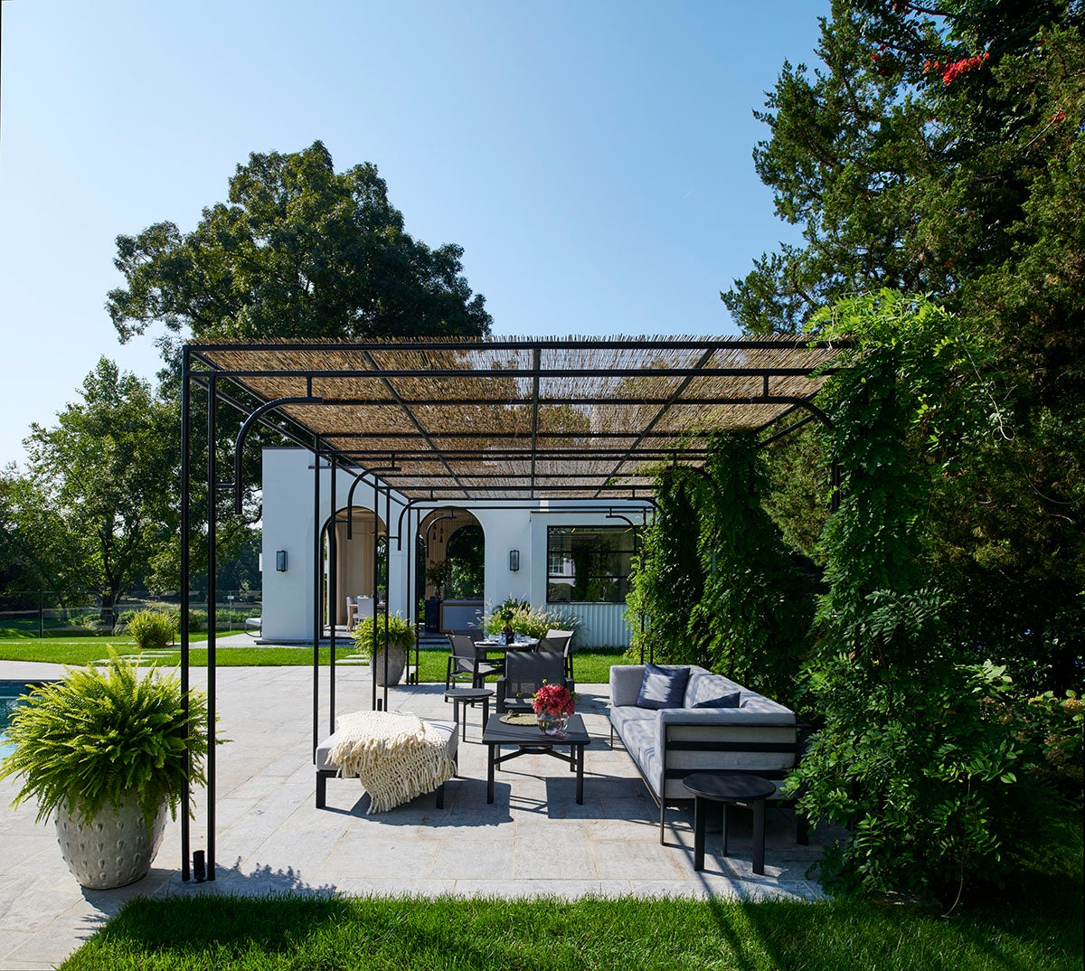 This ground up new pool house was our first project after starting LCS; conceived along with Douglas Wright Architects in a modern nod to the original architecture of the main house. The client wanted an all-weather building that could be completely opened up to house a lounge/ dining area, a small kitchen, storage & changing rooms, along with one bedroom. New pergolas were added by the pool and facing the tennis court for shady relaxation areas during playtime and downtime.