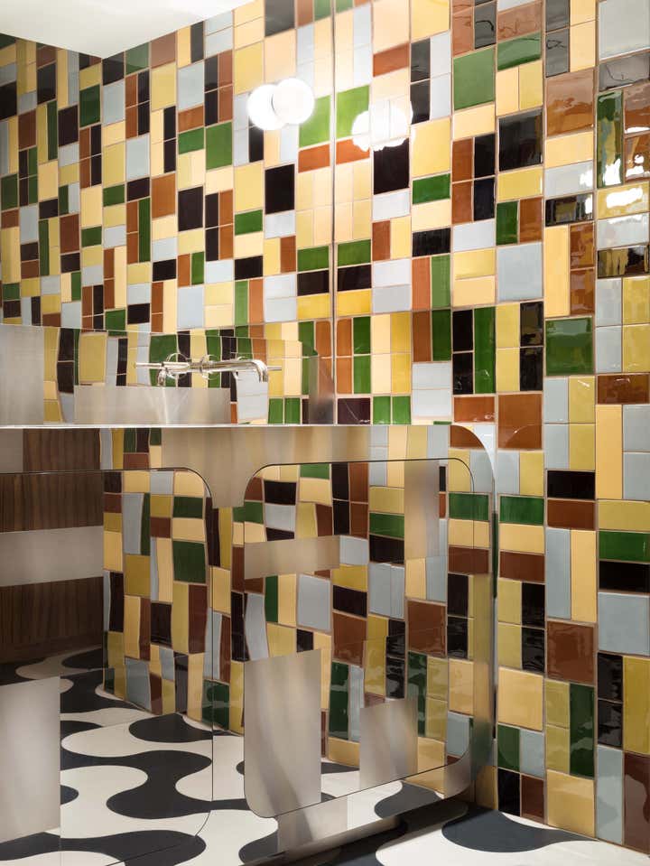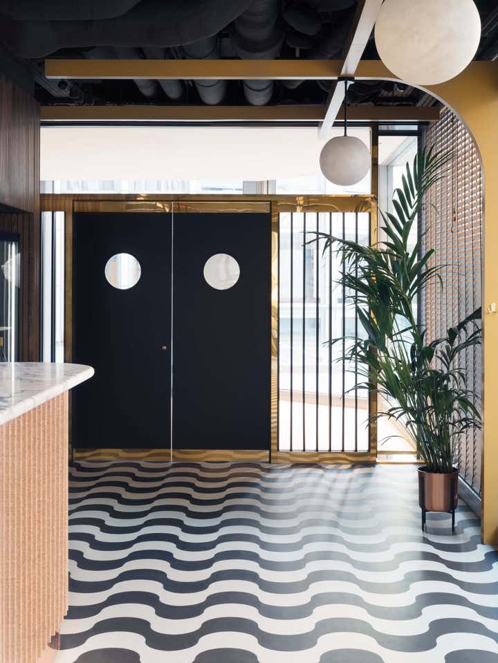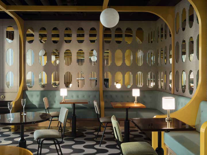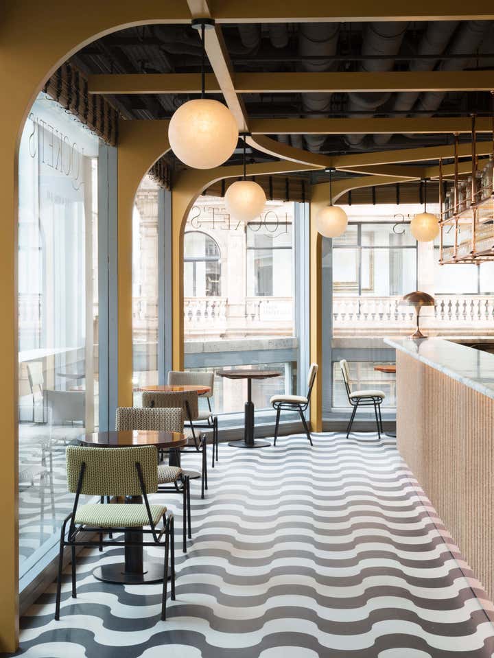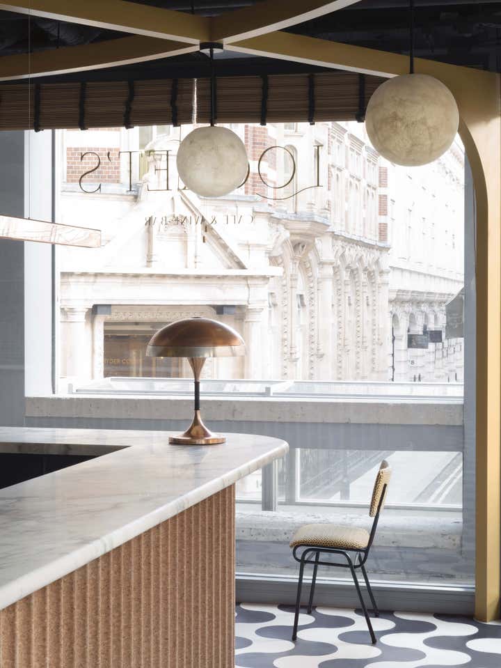 Behind the grand, often ancient buildings of St James’s stands a great monument to twentieth-century brutalism. Designed by Alison and Peter Smithson in 1964, this fourteen storey tower block, flanked by two low rise buildings, has now been radically reinvented and suitably renamed. Locket’s wine bar and restaurant – from the family team behind Wilton’s and Franco’s on Jermyn Street – sits within the double height reception area of the original building and opens out onto Smithson Plaza. The Smithson’s influence runs throughout Locket’s interior. Sudgen House (1955) inspires the monochrome polyvinyl flooring and veneered timber paneling. The House of the Future (1956) – along with the mid-century sensuality of Villa Borsani – inspire the curved lines and bull-nosed edging of the bar tops, as well as the scalloped detailing of the flooring and wall-mirroring – all of which bring a feminine curve to traditionally masculine lines. Working within the fenestration of the building’s original façade, timber ribs were used to emphasise the subdivision of the glazed elevations. These ribs wrap across the ceiling to redefine the interior space and frame the surrounding streetscapes. By extending rather than augmenting the existing structure, the studio has carefully honoured both the building’s heritage and its architectural philosophy.
