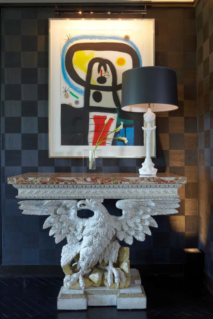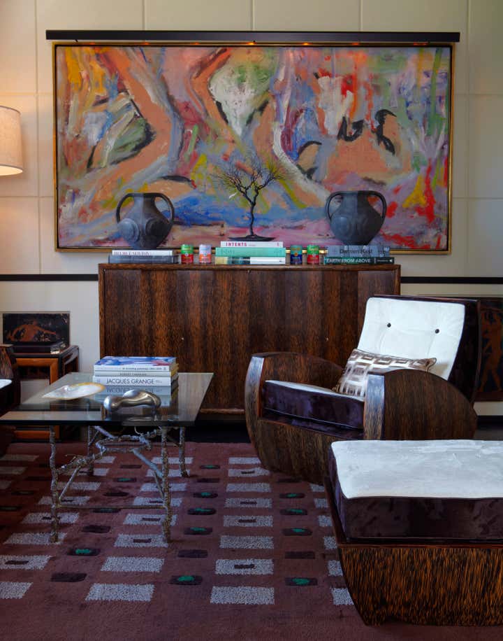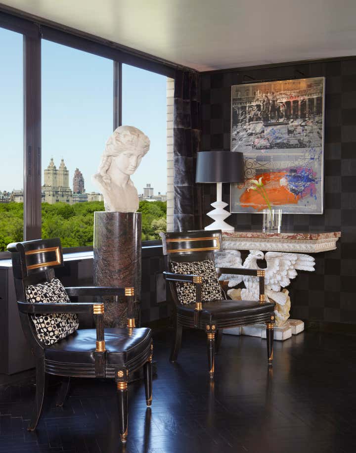 Located on the Upper East Side, on 5th Ave, overlooking the Central Park Pond is the home of Tony Ingrao and Randy Kemper. Included in the space are gems the two have collected; such as an Edgar Brandt desk, Bertoia spray sculptures, large antique painting of dogs on the hunt, paintings by Robert Rauschenberg, Miro, Ross Bleckner and Jonathan Meese, works also by Vanessa Beecroft, Art Deco carpets by Edward Fields, lamps by Giacommetti, and custom boucle cream fabrics from France. The space evokes warmth and sophistication through its mixture of varying rare woods, bronze details, supple woven fabrics and black marquetry walls.