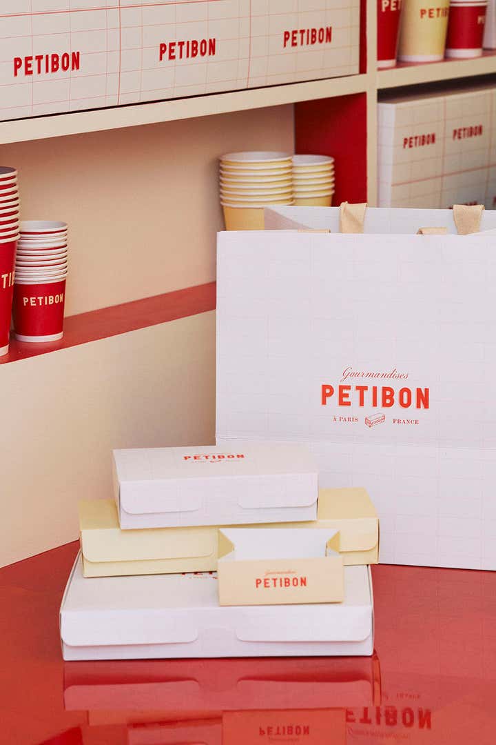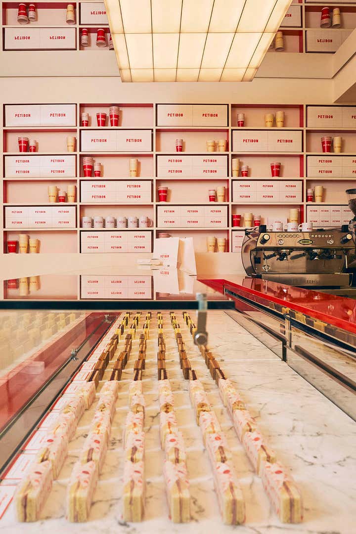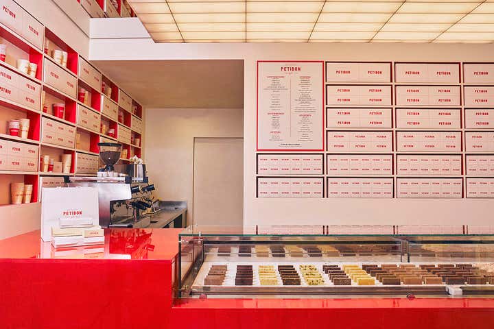 Inspired by the dimensions and shape of the small sandwich available at Petibon, the Uchronia studio has made it the modulor of this project. Ceiling lamp, counter or shelves of this first boutique of the brand thus replicate a rectangle 7 centimeters long in a tasty marriage of materials, know-how and colors.