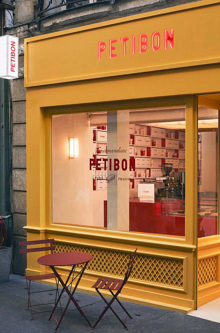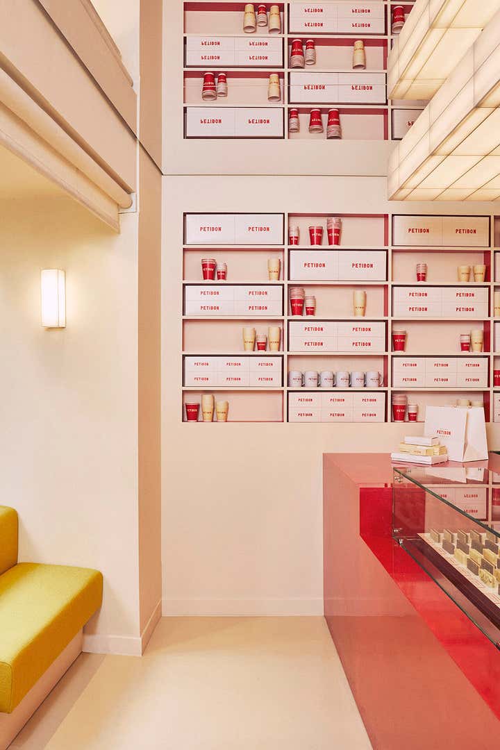With its undulating blind, the neo-Parisian facade imagined for Petibon recalls the leitmotiv of the collective, this «vague» motif that Uchronia likes to work so much. However, behind the deliciously regressive yellow, it is another shape, the rectangle, which combines and expresses itself, creating a link between the different elements. Inspired by the monoproduct work produced here, this monoform controls all the creative gestures of this shop. Illuminated sign and églomisé glass ceiling lamp by the artist Mieke Meijer, counter motifs in resin and Japanese copper sheets by Atelier Roma, composition of the built-in wall shelves, layout of the mirror ceiling and even cut-outs in the window, here, everything is rectangular. And made in Paris or France.