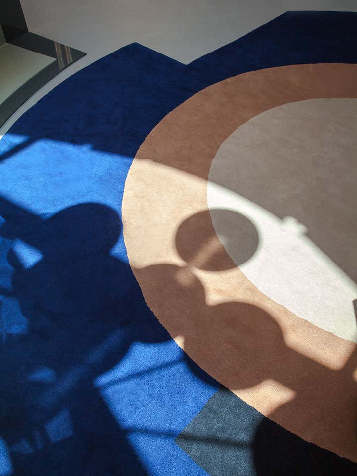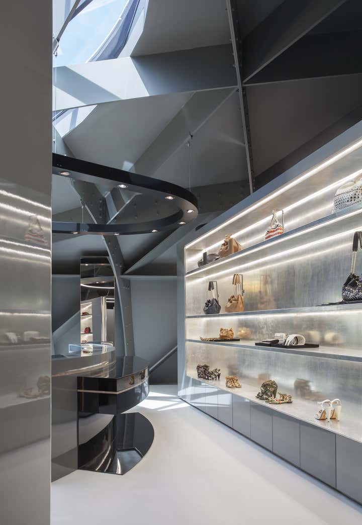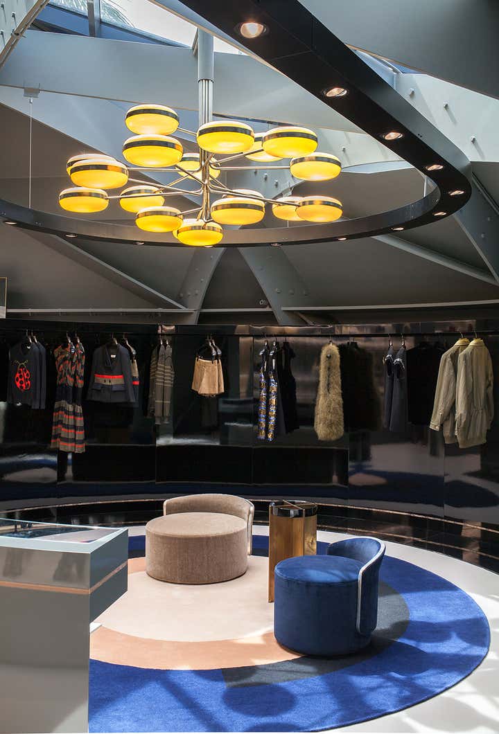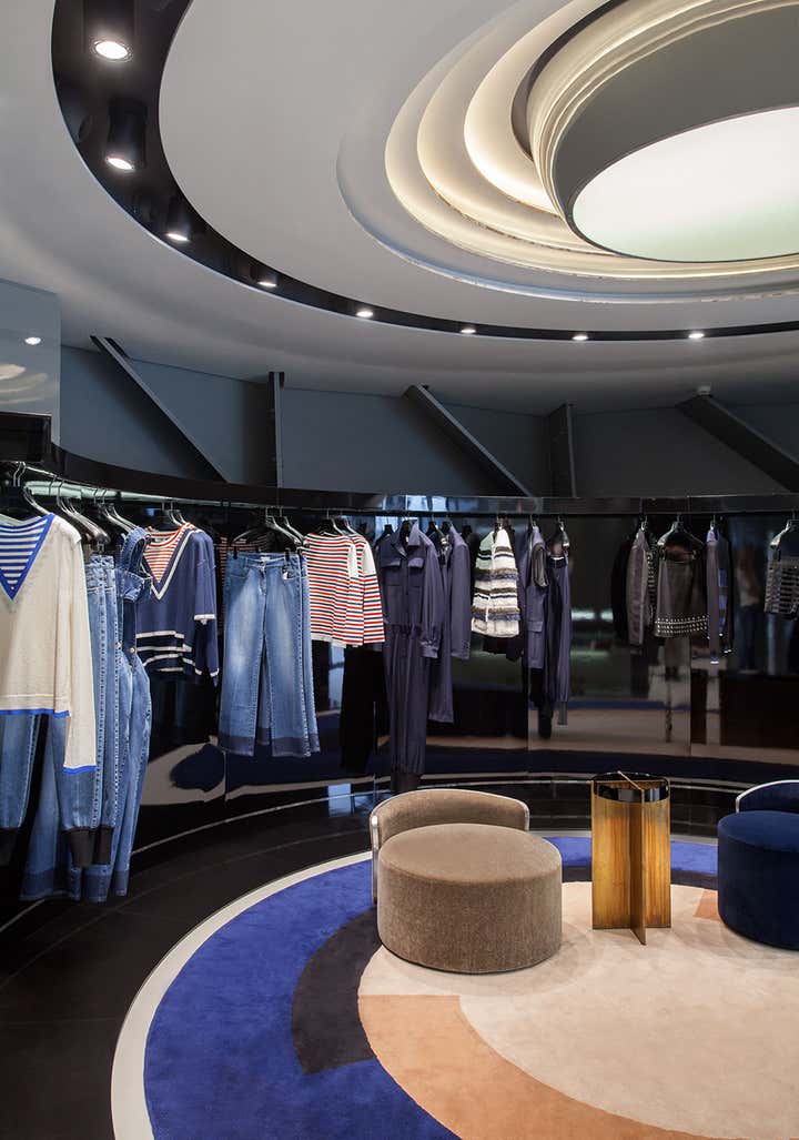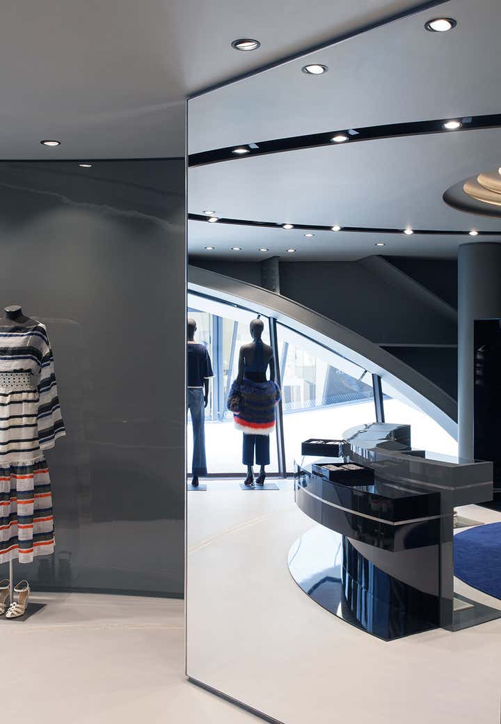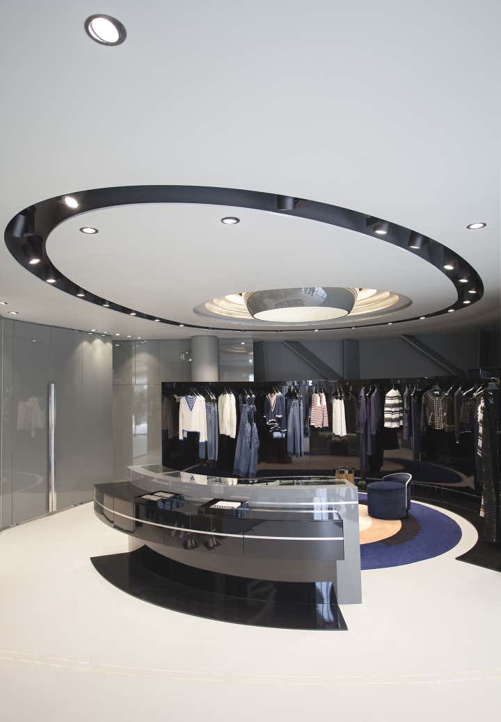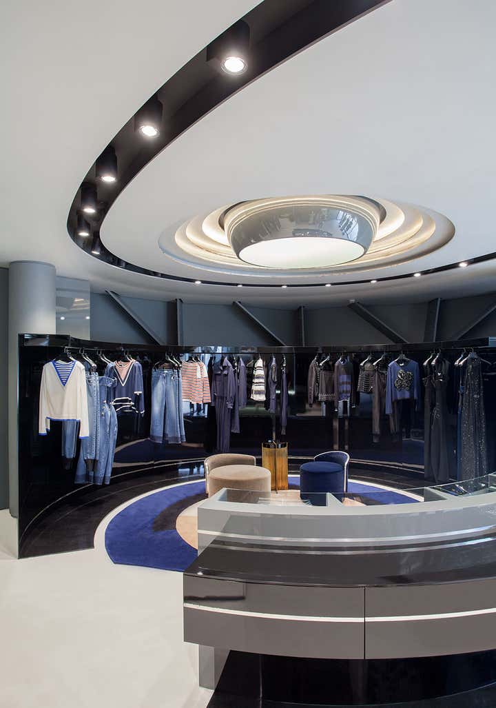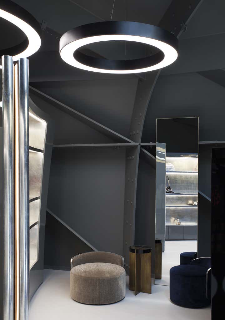 The racks, the central display, the system of shelves together with the coffee table and pouf, carpets and chandeliers were all designed "ad hoc”. They all respect the same code of colors (ranging from grey to blacks, glossy and matt, with touches of blue and beige and with the finishes always in aged silver-plated brass) and the code of the graphics related to the curved lines and circles.