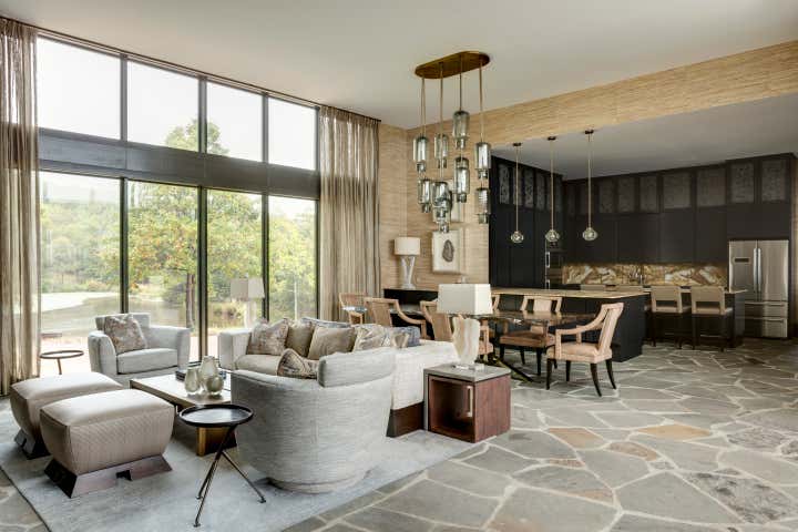 A home nestled in the Ozark Mountains, designed to bring the outside landscape inside the home creating one space with the surrounding natural beauty. Referred to as Boho Ozark Chic, this new style was created to invoke the spirit and personality of the client. A neutral, monochromatic color scheme accented with organic shapes, textures and materials bring to life an Ozark Mountain elevated experience.