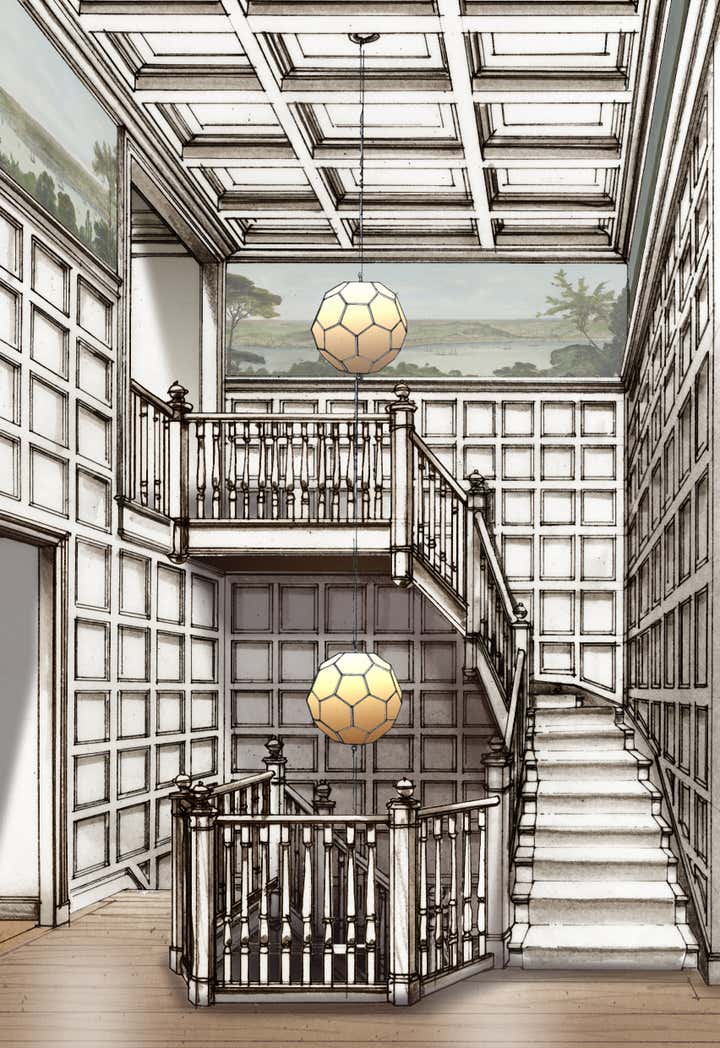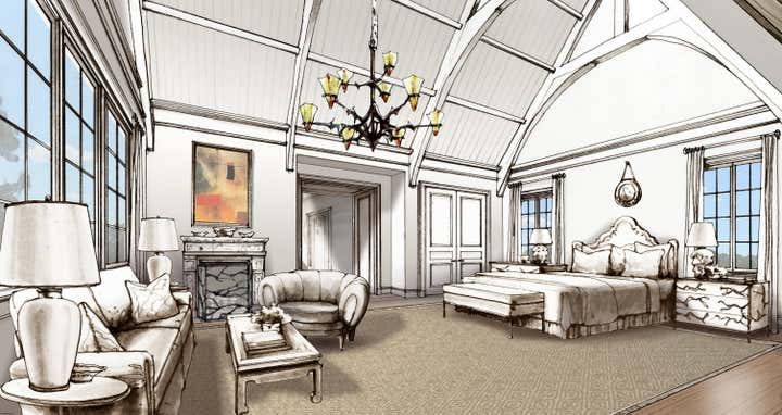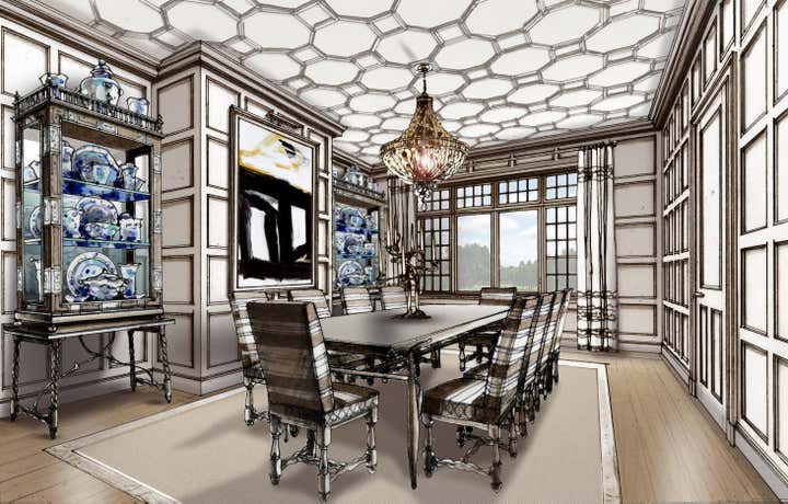 As part of our design development process, we often create perspective drawings to illustrate to clients our vision for the design of their homes. Here, we see a traditional English Tudor style of architecture updated for today's modern lifestyle with open plan living and an eclectic mix of vintage and contemporary furnishings.