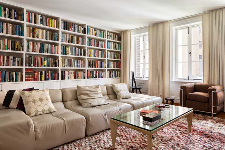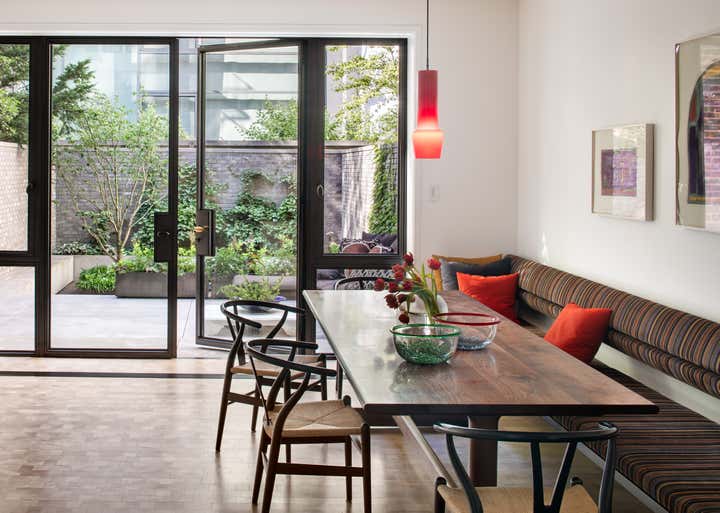 Located on a discreet block on Manhattan’s Upper East Side, this brick townhouse was completely renovated for a family with a generous social life. The family’s art and design collection—with a focus on postwar Italian modernism—enlivens the home throughout. The ground floor includes a large open kitchen with a bronze and transparent glass window wall that echoes the entry vestibule. End grain fir block flooring gives the space a rich materiality. A collection of vintage glass pendant lamps punctuates the room. Through the large bronze glass-doors, a two-level rear garden features a concrete plinth that steps down to a brick lower level with a custom bronze and glazed lava stone table. A muted gray brick wall encloses the garden with simple plantings. A deep blue carpet gives a white ribbon staircase a highly graphic quality, and unites the house floor-to-floor. On the private floors, all the family’s activities are graciously accommodated with spaces that reflect how they live. The roof features a small study and an intimate deck surrounded by a three-season garden with an abundant mix of edible, decorative, and native plants.