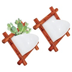 French Riviera style folding planter, Italy, 1970s. Wood and rattan structure with 3 folding parts, creating 4 spaces for pots and plants. The diameter of the spaces for the plants a...