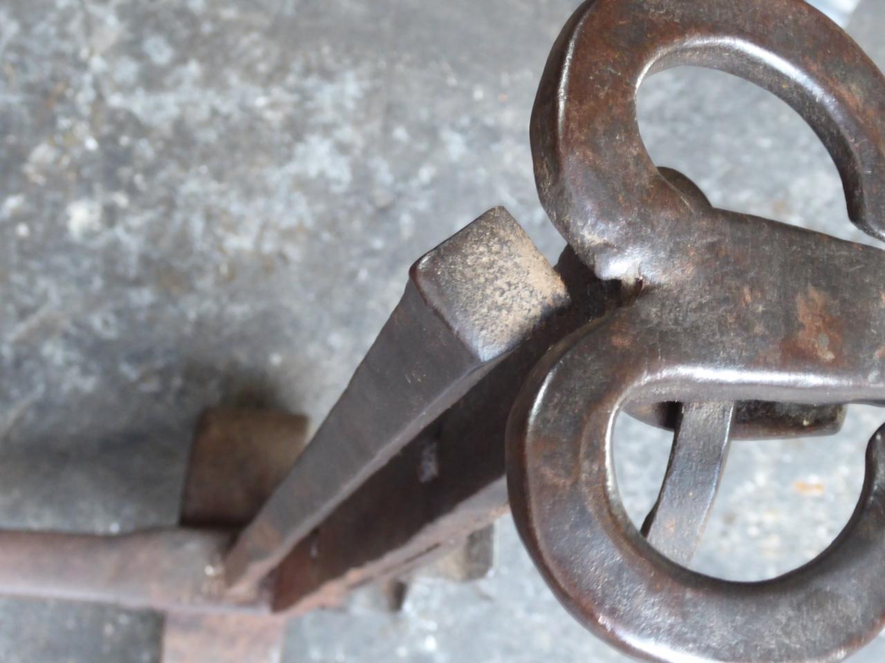 17th century monumental sized French Gothic firedogs made of wrought iron.