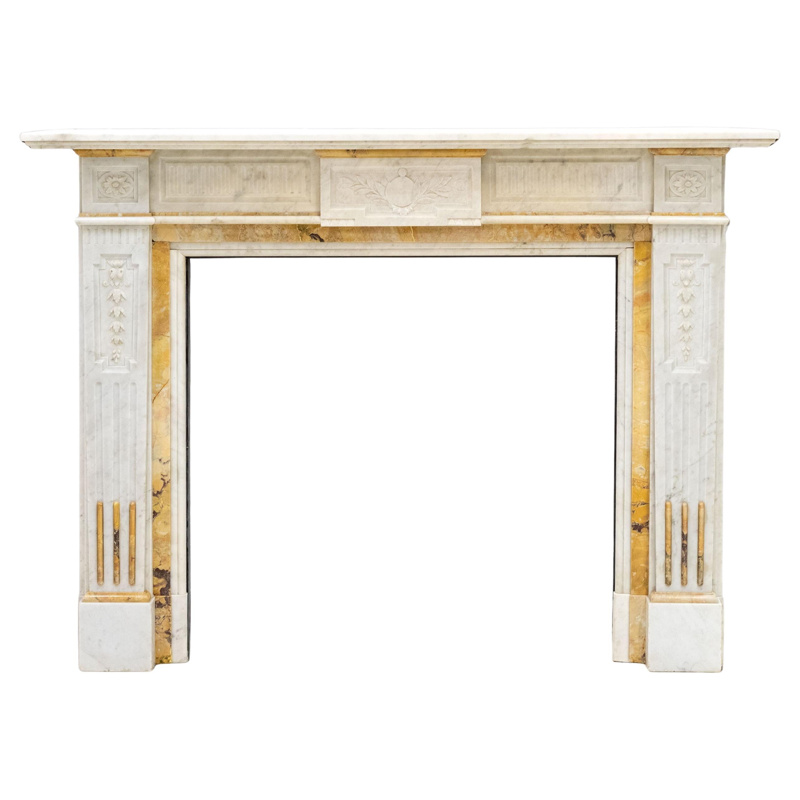 A very rare 18th century George II sienna and white statuary marble fire surround in the manner of Louis XV, designed by Isaac Ware. Principally of well figured sienna marble with statuary marble shelf and embellishments. Of serpentine form, the frieze centred by a carved statuary peacock flanked by scrolling acanthus leaves. The hipped jambs mounted with ‘C’ scrolls above an elaborate acanthus ‘S’ scroll terminating in a rosette and suspending graduated husks. The whole standing on block feet.