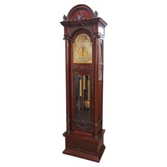 Late 20th century Howard Miller 610-376 Grandfather Clock, serial number 592902. Features a tall Georgian style case made from flame mahogany with quarter cut reeded columns and an ...