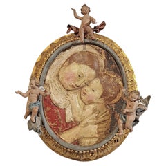 Beautiful weathered giltwood winged angel head, Italy, circa 1750 Weathered . Measurements include the wooden base. H:18,5cm W:16cm D:8cm