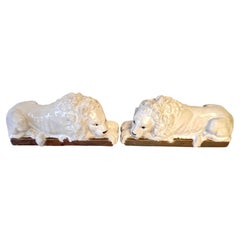 A striking pair of vintage ceramic foo dogs in a vibrant turquoise blue glaze, dating to the 1980s. Rich in character and symbolic presence, these guardian figures feature expressive...