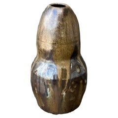 A vintage pottery vase designed by Niels Refsgaard for Dansk. Hexagonal shape in the "Brown Mist" pattern. Pale gray speckled glaze with brown trim and an unfinished edge at the base...