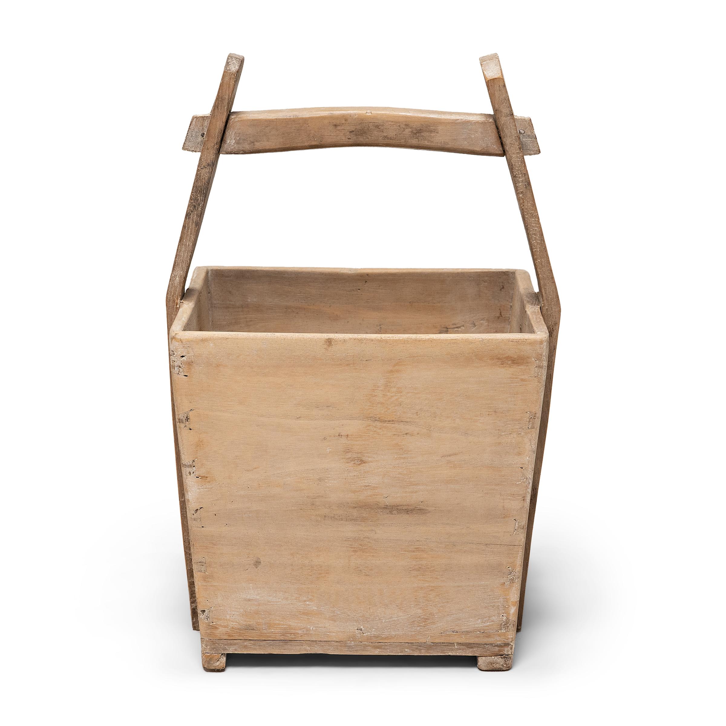 This hand-crafted wooden bucket was once used by farmers in Shanxi, China to transport their harvest of rice and grains over long distances. Counterbalanced by a second container, the pail would have been lifted by a pole threaded through the tall handles and supported across one's shoulders. The rustic vessel has a basket-like form, with a square basin that narrows at the base and sloped handles connected by a horizontal bar. Years of use have weathered the large bucket with inimitable texture, particularly at the handle, now burnished smooth from the touch of many hands. Today, this storied grain container lives on as a storage basket for magazines, toys, firewood or balls of yarn.