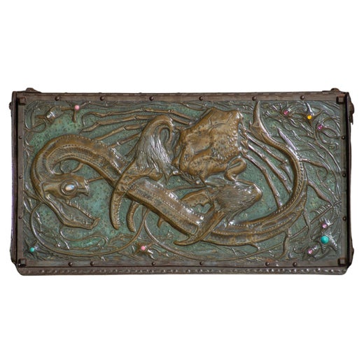 As a promoter and purveyor of Japanese objects, Bing capitalized on the craze for Japonisme by expanding his commercial galleries from 1895–1904 to include artist workshops capable of making everything conceivable to create harmonious interior spaces. Daguet’s finely-worked repousse copper sheets clad many decorative letter and desk boxes sold at Bing’s shop in the early-1900s. These boxes which Daguet often further embellished with colored glass unquestionably reflect the tenets of the Art Nouveau aesthetic.