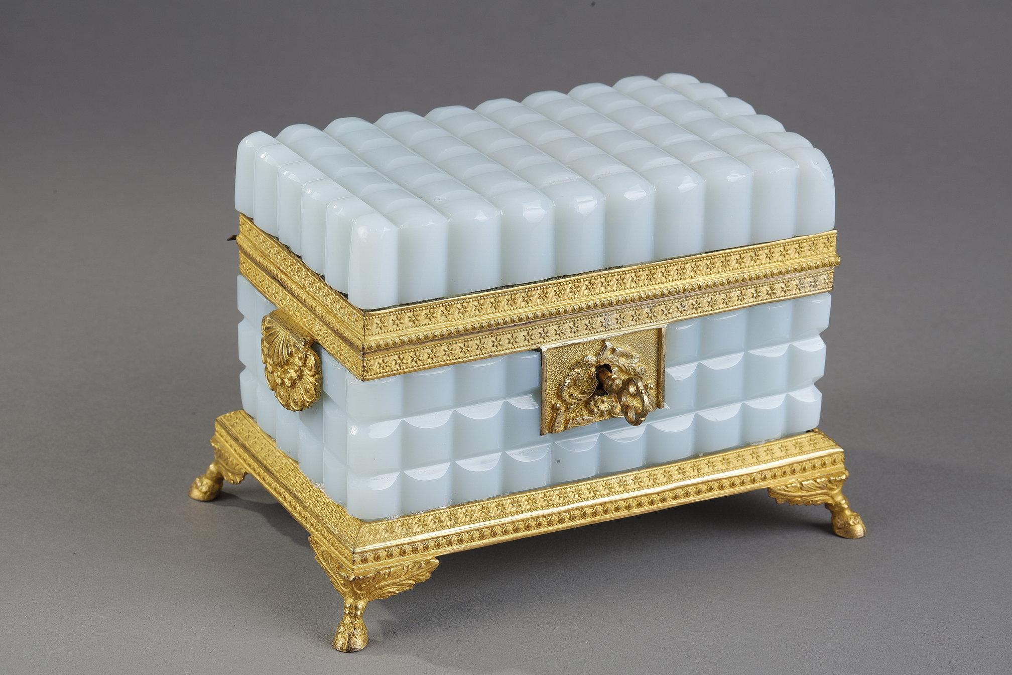 "Bulle de savon" opaline box and its hinged lid of a checkerboard size comprising four small gadrooned bottles with their glass stopper and their gilded metal lid. In the centre a finely chiselled funnel allows to fill the containers with perfume.