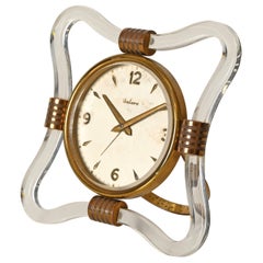 A newer sophisticated take on the grandfather clock with the case in smoked Lucite defining the outline of the clock. The face has a brushed aluminum face with mod hands in red and w...