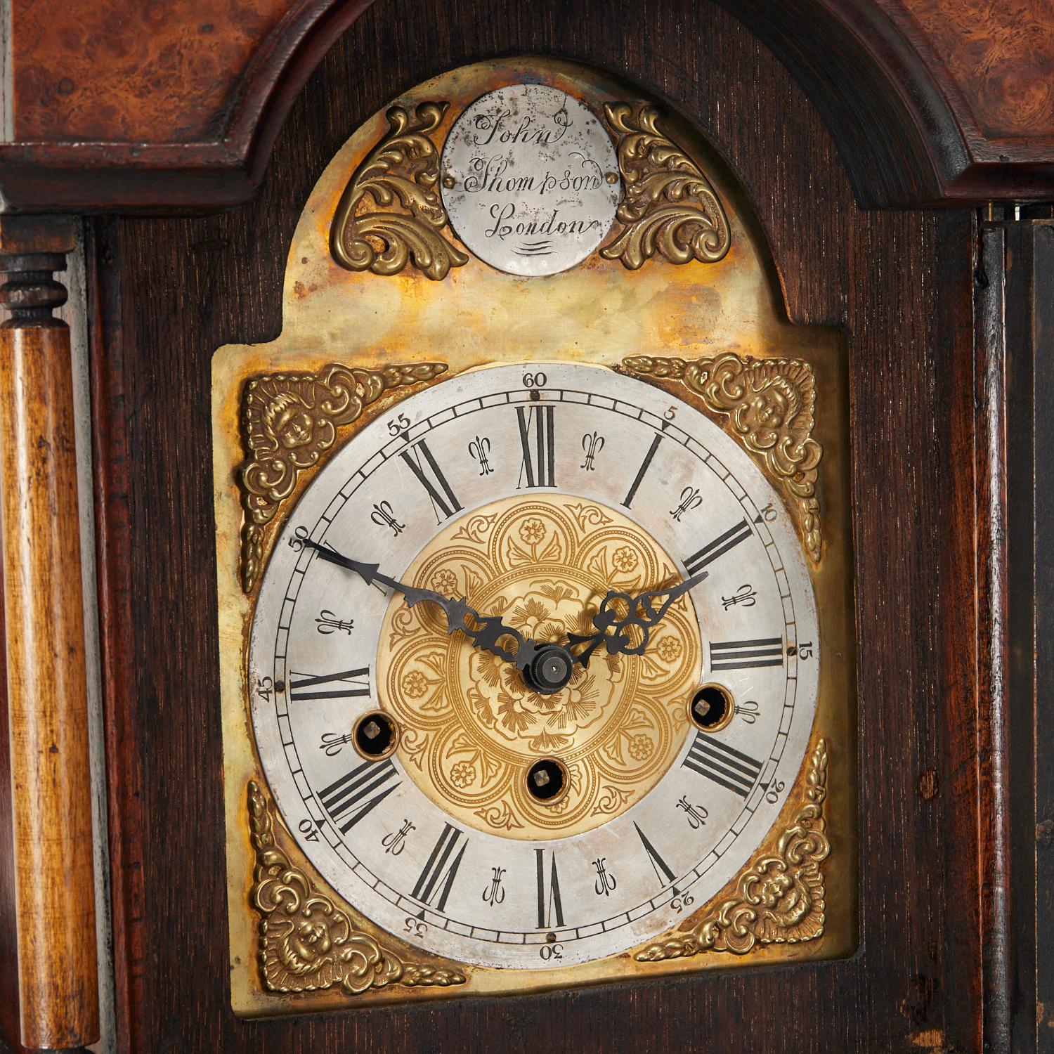 20th c., London, a grandmother clock in a wood case with mixed veneers, with scrolled open pediment top, hinged door opens to brass and silverplate Roman numeral dial, face marked "John Thompson London" flanked by columnar supports, on bracket feet, eight-day three-train "Le Rose" West German movement, with pendulum and key.