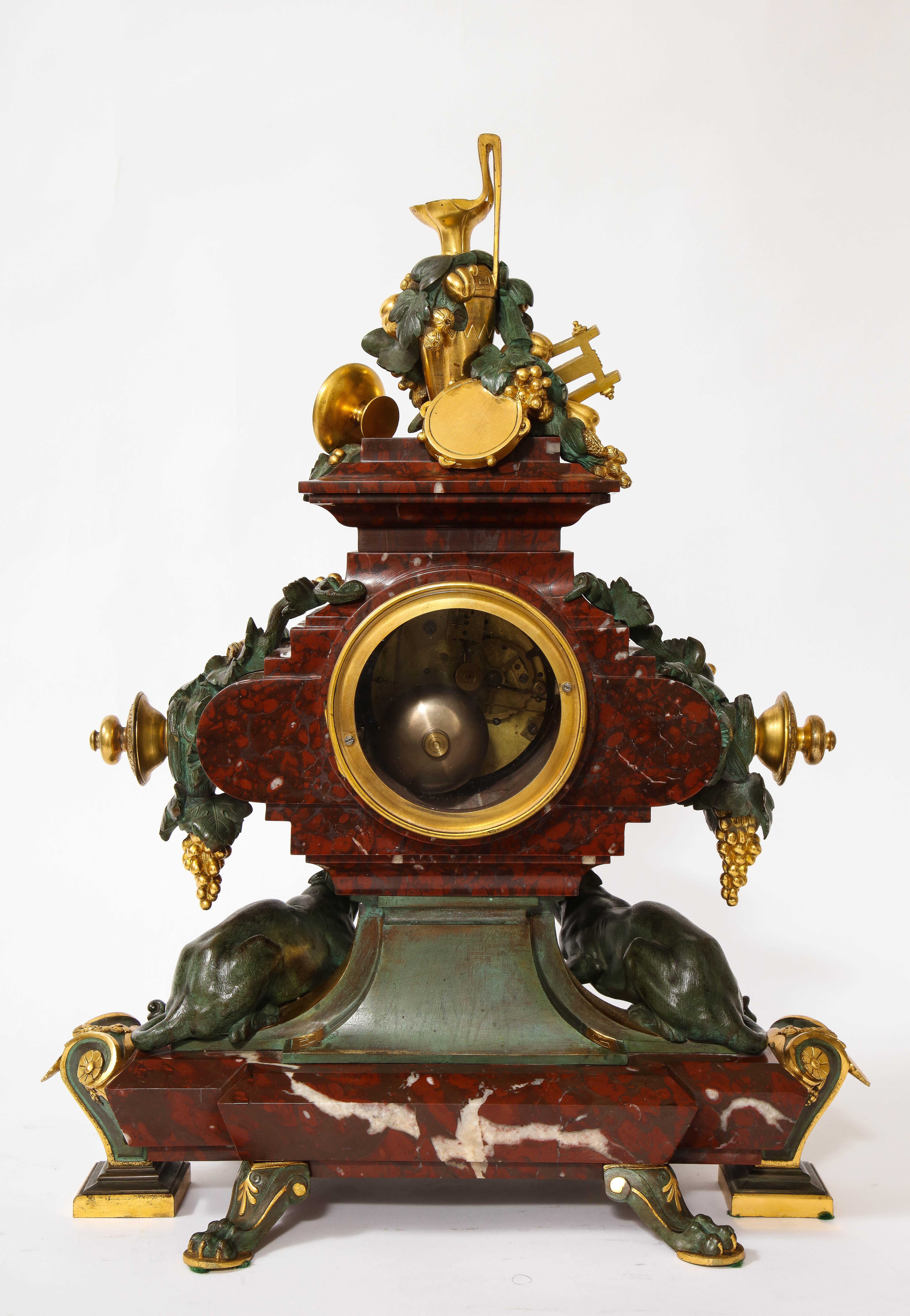 The structure is anchored by robust, paw-footed bases adorned with ormolu masks and acanthus scrolls. The clock rests on a substantial marble plinth, flanked by reclining bronze panthers, with cascading grape clusters applied throughout. The tazze feature a similar motif, with their upper platforms edged by Greek key borders and topped with fluted finials. The ormolu accents provide contrast against the verdigris patina and deep red marble. This garniture is extraordinarily rare. The entire construction of the pieces is highly detailed and very masterfully done. Each section of bronze is exceptionally cast, hand-chassed, and hand-worked. The bronze mounts are also either finely gilt or patinated. The rare rouge marble body is all hand-carved and hand-polished with meticulous detail. This is absolutely a masterpiece object and the only one we have seen like it in over 5 generations of working with art and antiques.