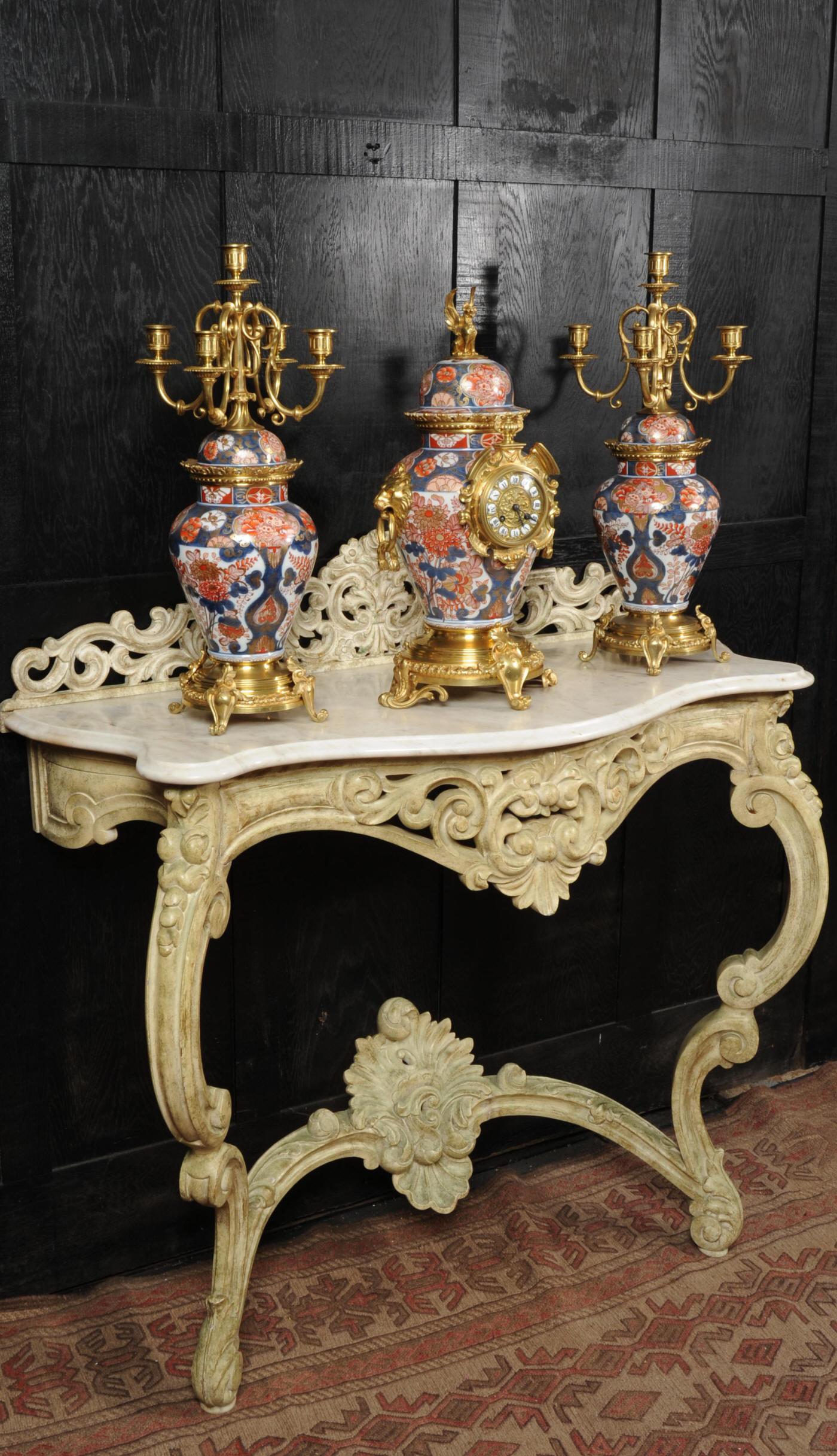 The vases sit on heavy gilded bronze bases with scrolled feet. The clock is surmounted by a winged mythical creatures and has a pair of lions mask handles. Candelabra are surmounted by four elegantly scrolled branches. The gilding is in lovely fresh and bright condition which contrasts beautifully with the Imari Porcelain.