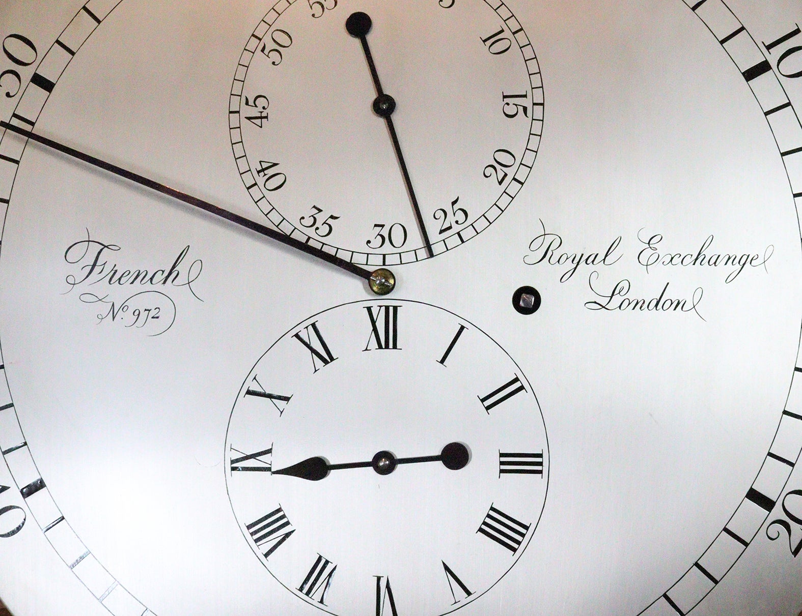 The gilt dial is signed as is th back plate of the movement, the centre of the dial is engraved with foliate scroll work with a roman chapter and breguet style moon hands.