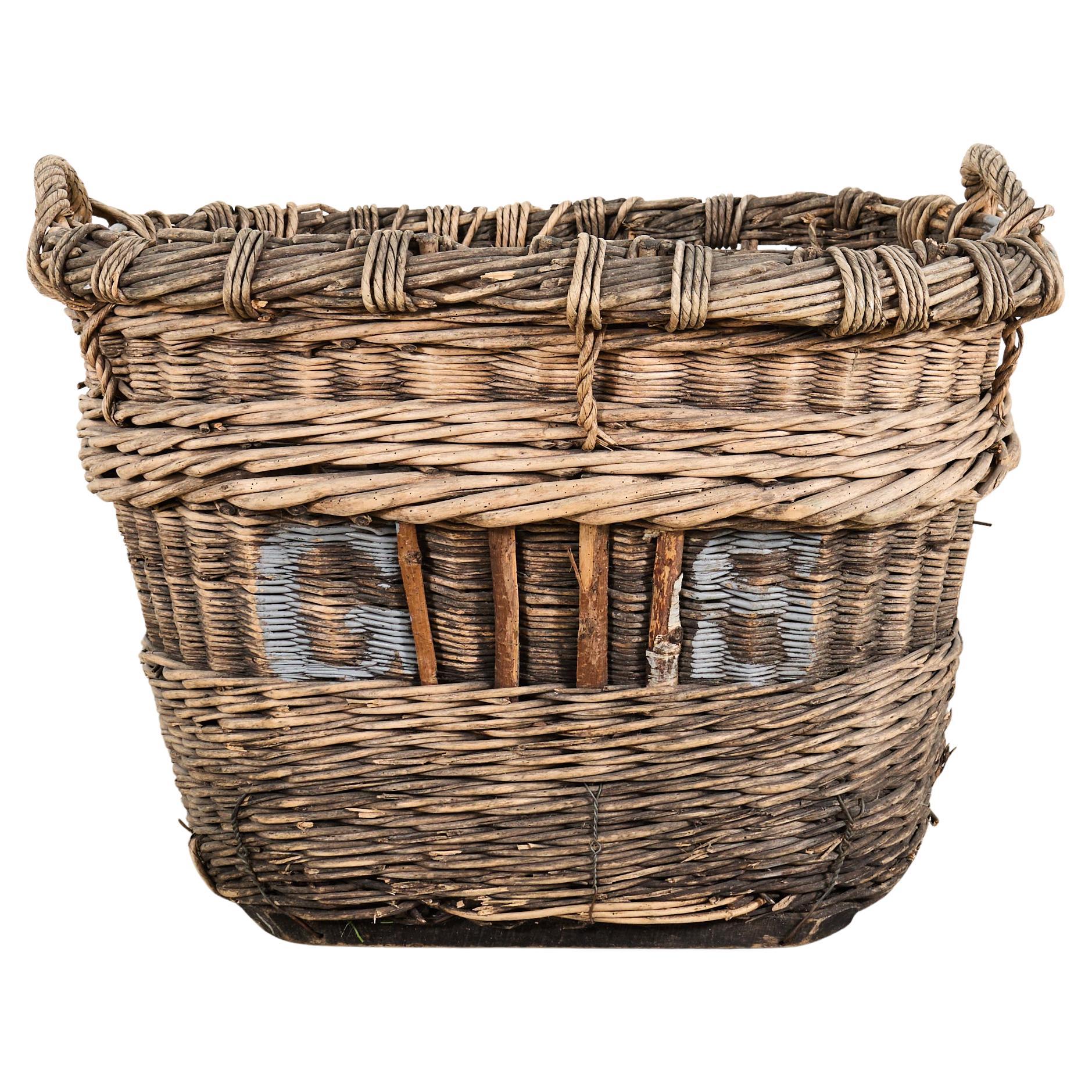A large and beautifully weathered handwoven French vineyard wine harvest basket in thick woven wood wicker, rattan reed, and wire. The basket features a broad oval mouth, wrapped rim...