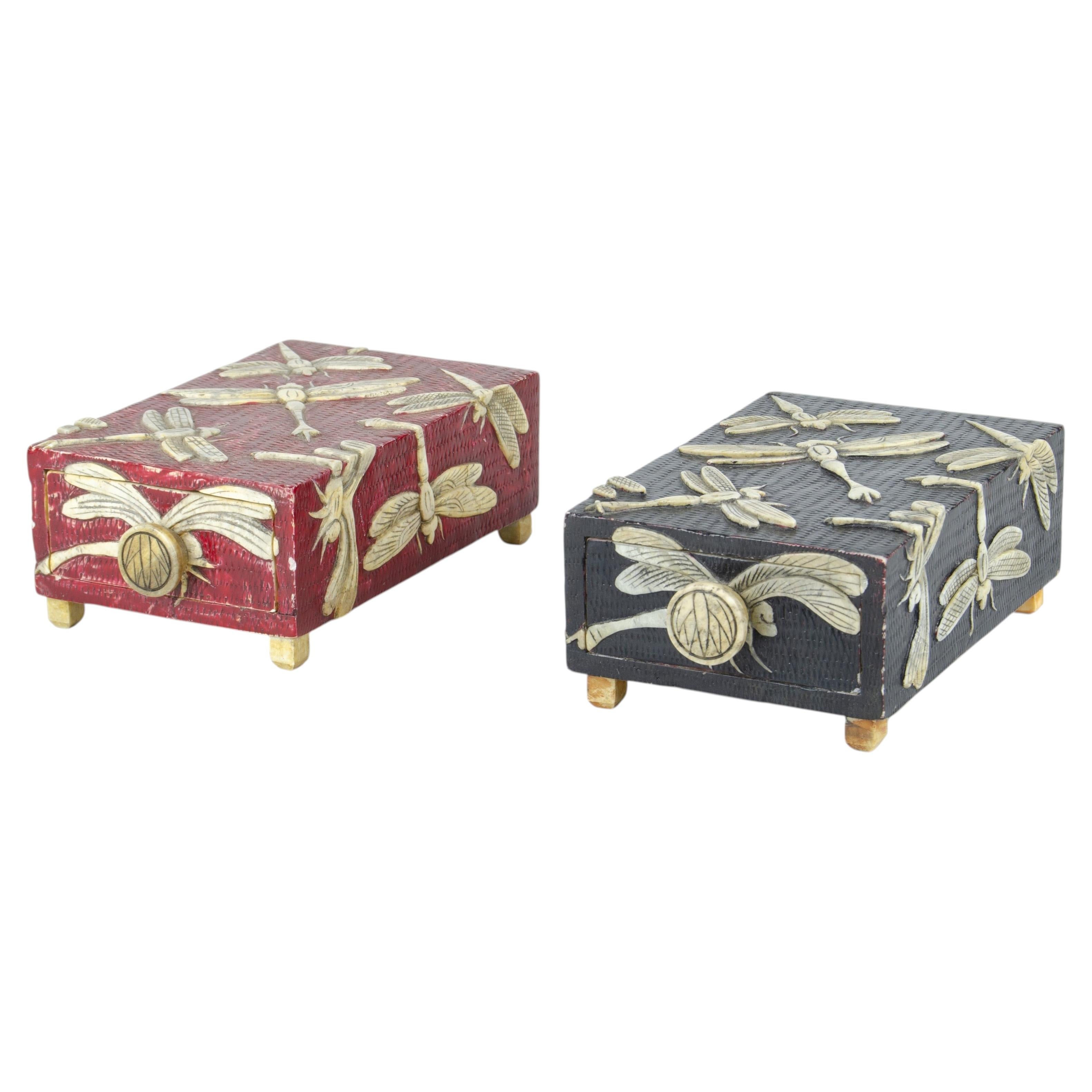 Pair of mid-20th century wood jewelry boxes with carved soapstone dragonflies, Vietnam By: unknown Material: soapstone, stone, wood Technique: carved, hand-carved, hand-crafted Dime...