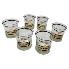 2 Pairs of French Pernod glasses with blue striping for measuring. One pair with red label and one pair with blue label. Pernod Fils was the most popular brand of absinthe throughout...