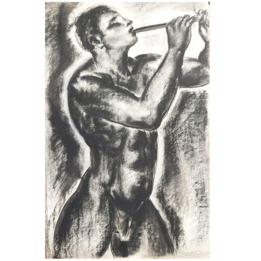 Paul Daxhelet was born in 1905 in Belgium. He initially studied in Liège, then later in Paris. Daxhelet uses waxy crayon or pastel to remarkable effect and surrounds his Pan with an aureole that adds to his otherworldly appearance. Daxhelet depicted many figures from the world of sports in his early years, and later depicted scenes from East Africa, where he visited with great interest.