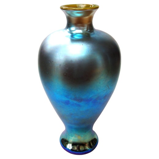 The Steuben Glass Works was cofounded in 1903 in the town of Corning, New York, by Frederick Carder, an alum of celebrated British glassmaker Stevens & Williams and a self-taught English chemist and glassmaker. Carder was a restless experimenter, constantly creating new color formulas that resulted in a wide array of hues, from milky jades to his iridescent Aurene shades. A favorite Carder technique was to acid-etch decorative patterns into pieces made of glass layered in different colors. The forms of his vessels were relatively conservative. Most are based on classic Chinese pottery; many display the flowing, naturalistic lines of the Art Nouveau period.