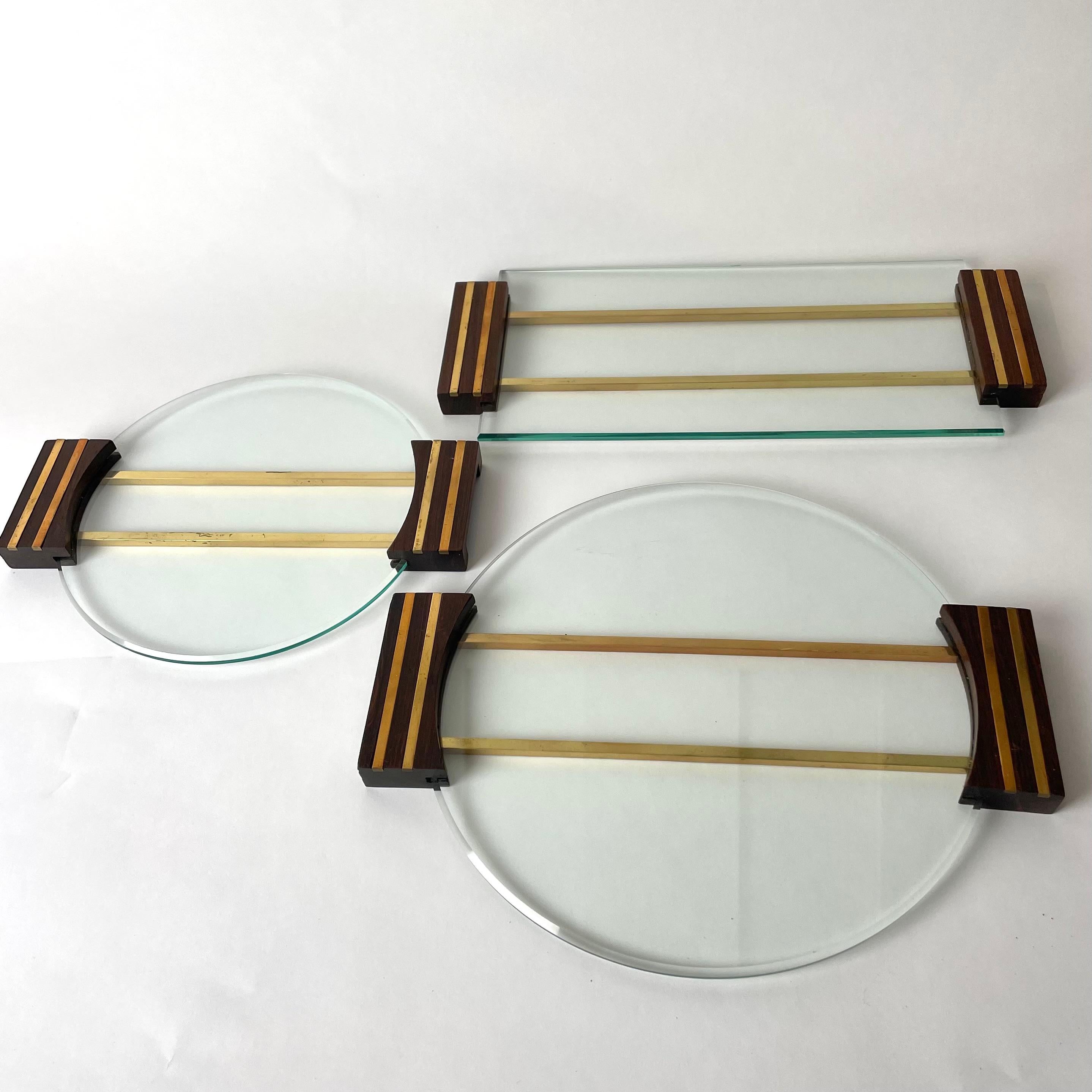 Elegant set of three Cheese Trays from the Mid-20th Century. Cool design in glass, brass and wood.