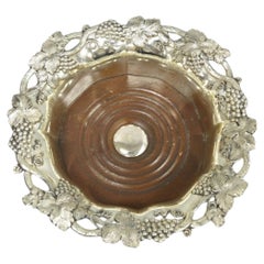 Vintage English Victorian Silver Plated Copper Wine Bottle Coaster. Circa Mid 20th Century. Measurements: 1.5" H x 6.5" W x 6.5" D.