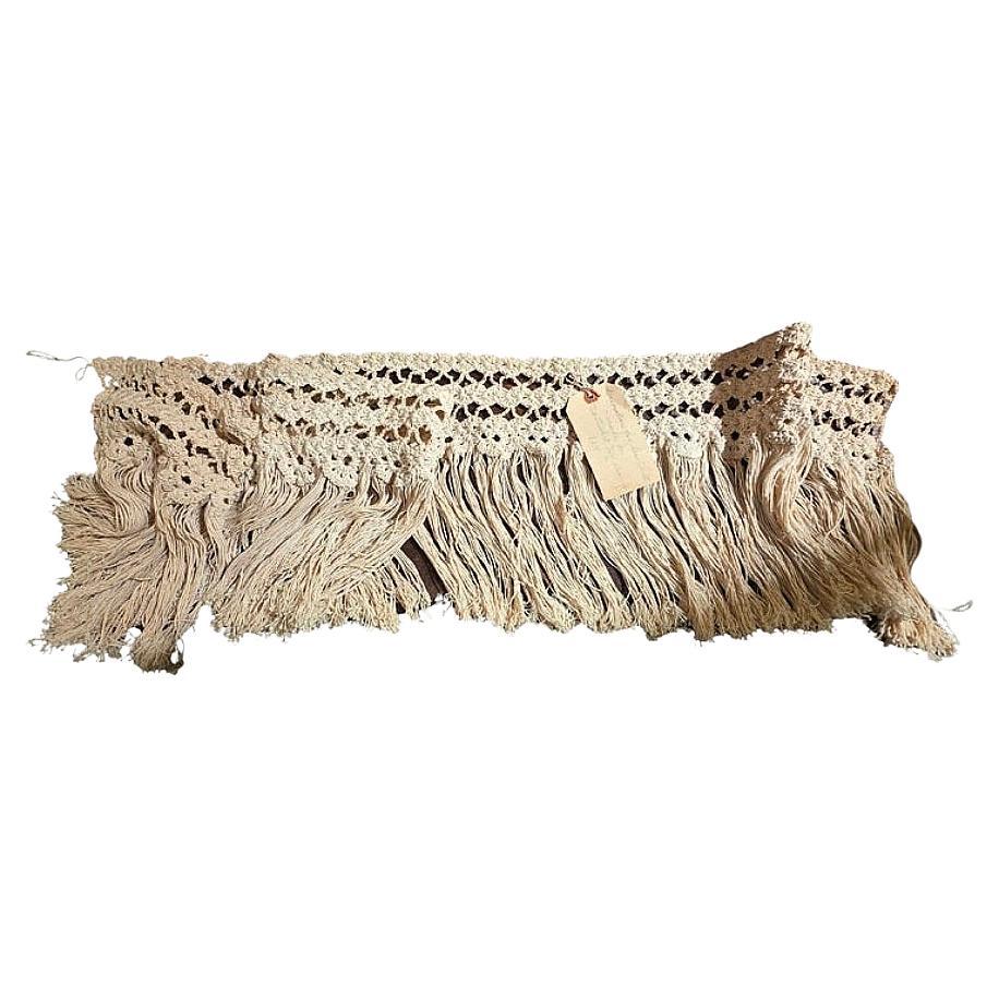 Sailor-made from Nantucket, often called "McNamara's Lace" or fancy work, was typically crafted from durable materials found on ships, primarily fishing twine, white cotton rope, or tarred hemp. These functional art pieces, such as baskets, hammocks, and belts, were created using square knots during long voyages. This is an absolutely beautiful piece of sailor made macrame fringe. On it is a tag from the nineteen twenties stating " decoration for sea chest made on nantucket whale...