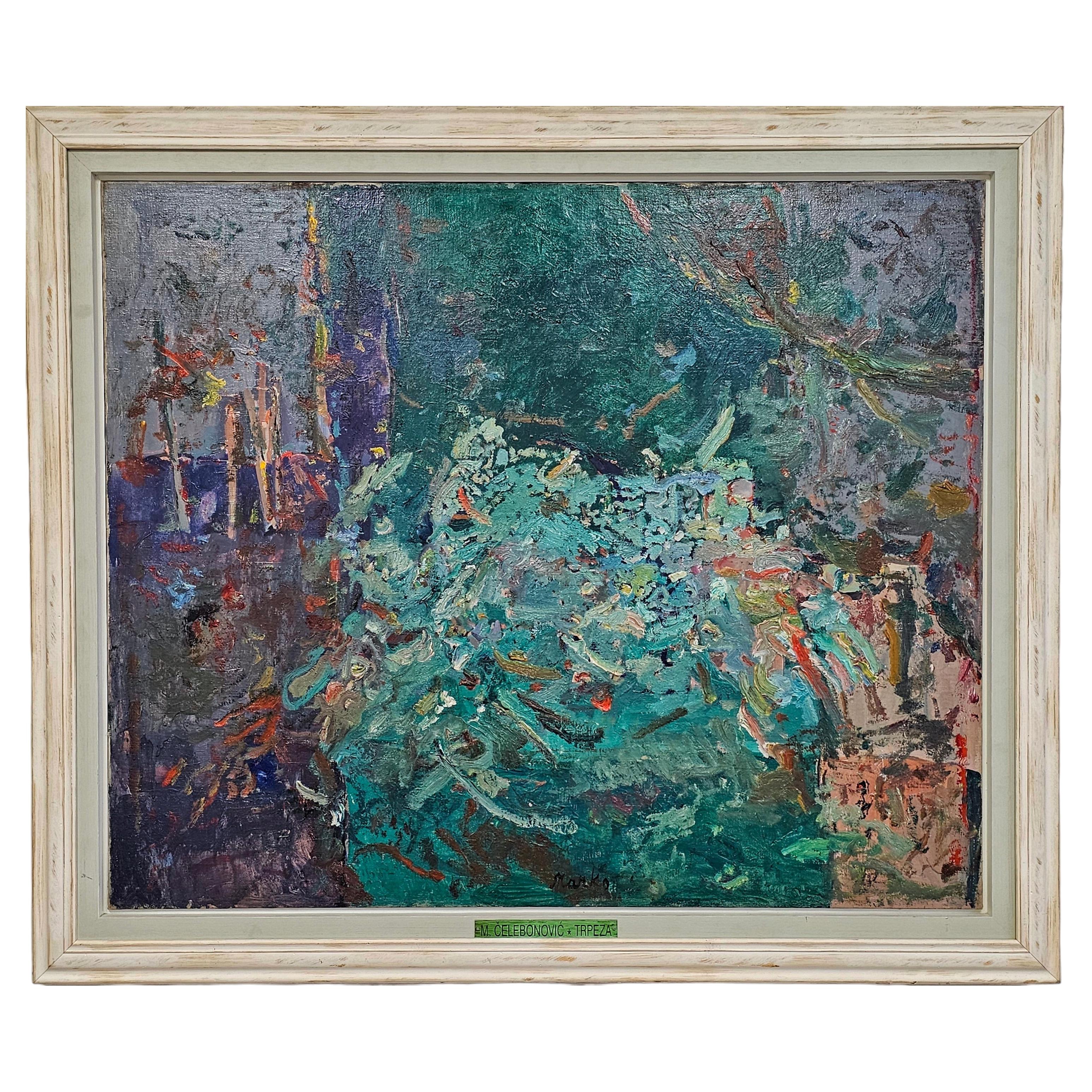 It has a beautifully hand painted carnation and tulip in burgundy, light and dark blue and turquoise foliage.