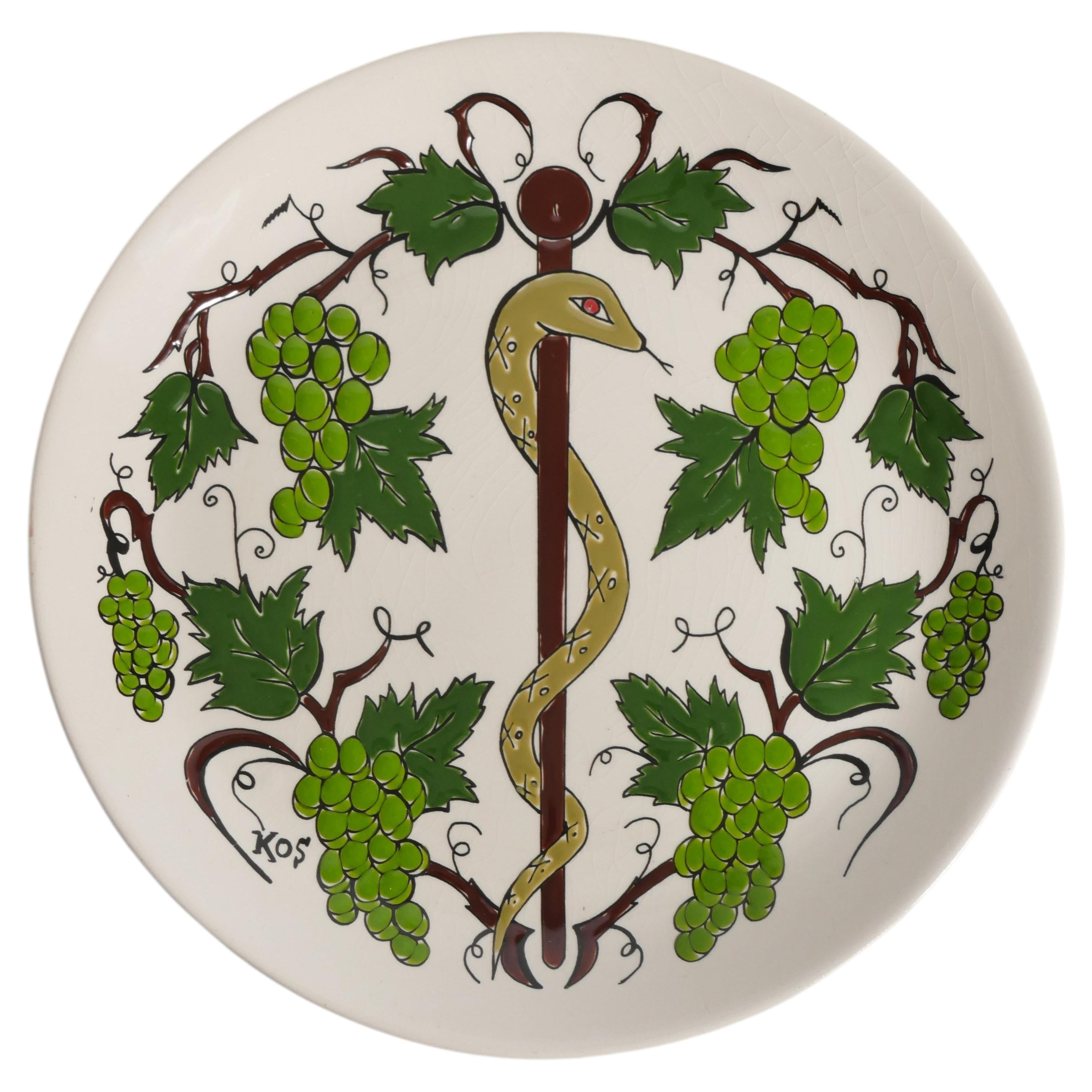 A decorative I Karos pottery, I Caro collector polychrome hand painted and handcrafted in Rhodes, Greece ceramic wall decorative plate with an antelope, carnations and tulip polychrome design.