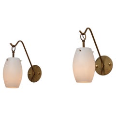 Pair of Italian wall sconces from the 1950s, characterized by an elegant and well-balanced mid-century modern design. Each sconce features a slender, gently curved brass arm that ext...
