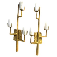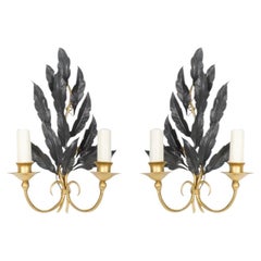 A sculptural and distinctly modern pair of Italian wall sconces from the 1950s, characterized by a graphic, architectural composition. Each sconce is built around a slender, angled v...