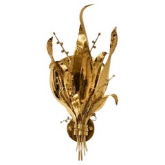 Pair of Italian wall sconces from the 1950s, characterized by an elegant and sculptural brass structure with a naturally aged patina. The design features a curved arm that rises from...