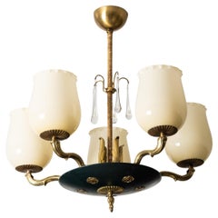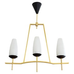 Italian chandelier from the 1950s, composed of a brass structure with three opaline glass shades. Each shade is positioned on a curved brass arm, arranged around a central joint that...