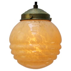 This elegant Art Deco pendant was designed and manufactured in Germany in the 1930s during the Bauhaus period. The light features a ribbed marbled opaline glass shade in warm honey...