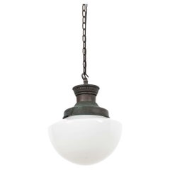 German Art Deco Opaline Pendants, 1930s, Bauhaus era The lights feature elegant German Art Deco design with a patinated brass rod and canopy, complemented by a decorative moss green...