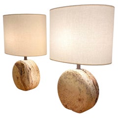 A beautifully sculptural vintage table lamp in solid travertine, likely dating from the 1980s. Discovered in the South of France, the lamp features a short, flat base topped by a rounded form that rises with quiet presence—compact yet weighty. Carved into the travertine body are three concentric circles that echo the overall silhouette, adding subtle geometric interest and reinforcing its architectural quality. The creamy, natural stone surface shows soft veining and tonal variation, typical of travertine and full of organic character. The original French plug and cord are still attached, suggesting its age and provenance. This can easily be updated with a new wire and plug or used with a simple adapter. A minimalist yet warm piece that works beautifully as an accent light on a shelf, console, or bedside table. In good overall condition. Lampshade for display only and not part of sale. Please enjoy the accompanying photos to this listing. Upon request a video will be provided.