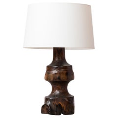 This table lamp originates from France and dates to the late 1930s. It features a geometric wooden base with a distinctly architectural character typical of the period. The oak base...