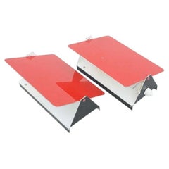 A distinctive and subtly playful pair of Italian wall sconces from the 1950s, defined by a sculptural composition in brass with contrasting material details. Each sconce features tw...
