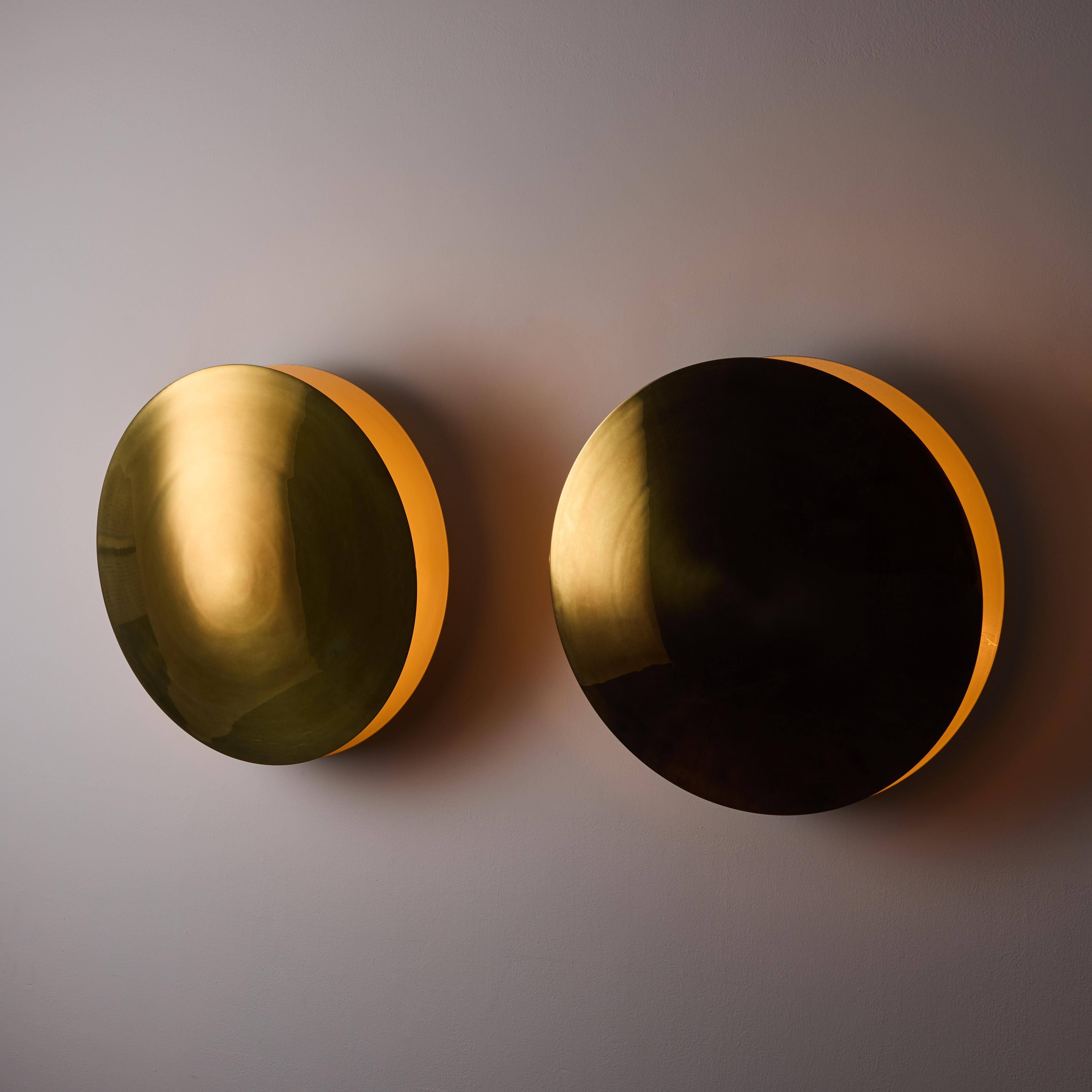 Rewire Custom Brass Castanet Sconces. Polished brass and enameled interior diffusion. Each sconce holds a single E27 socket type, adapted for the US. We recommend a single 40-75w max bulb or LED equivalent. Sconce naturally patinas over time to resemble the result in the photographed image. Priced and sold individually.