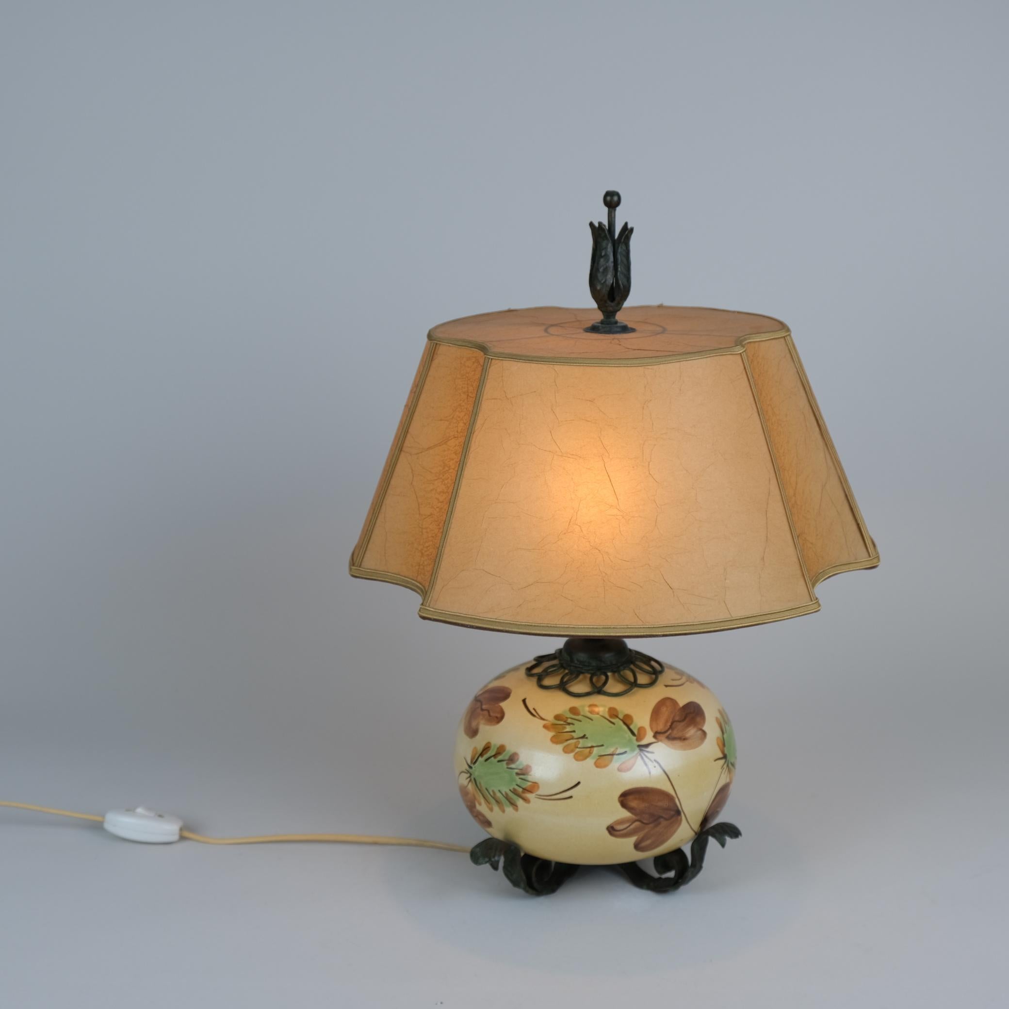 The table lamp is in great original condition with a browinsh/greenish patina on the iron. The lamp shade is original and in great condition. The lamp body is made of ceramic and is hand painted. Most probably by the Finnish ceramic company kupittaan Savi Oy.
