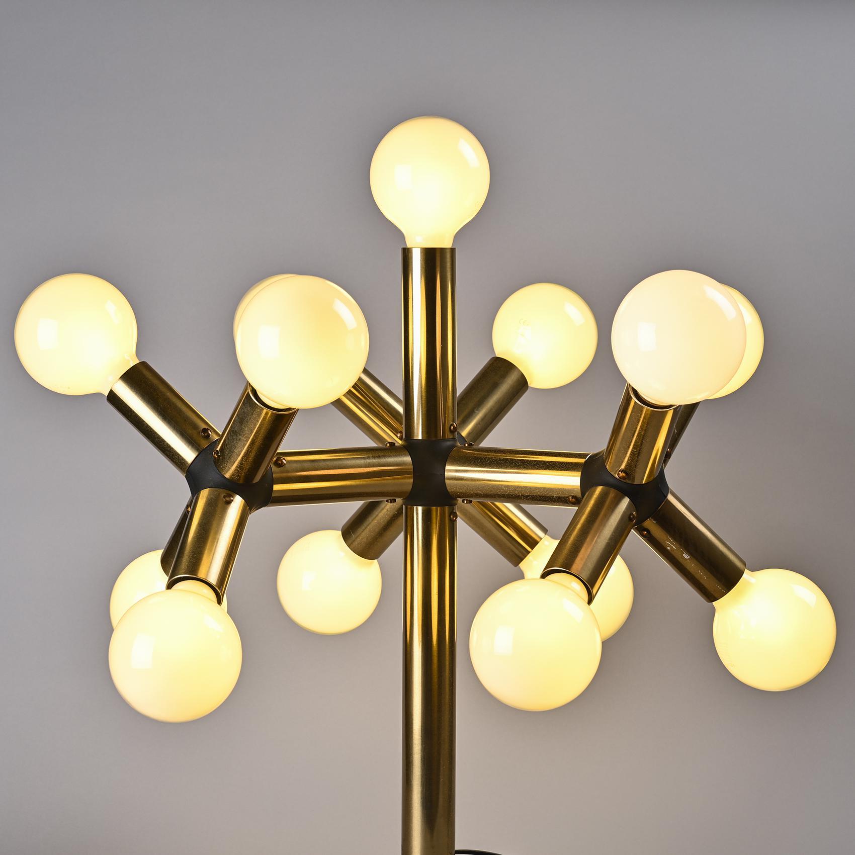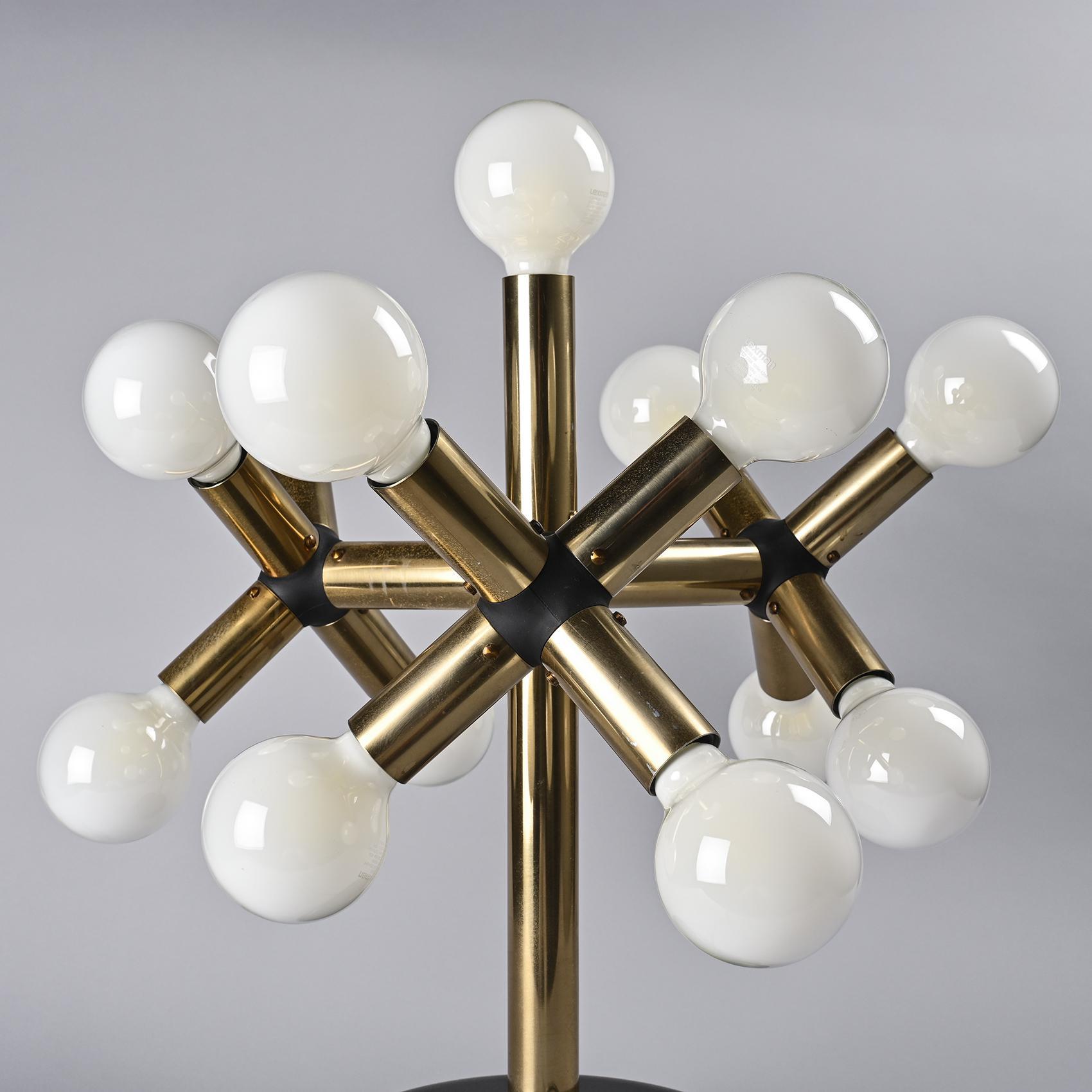 Atomic brass table lamp with nine-glass globes. The globes are hand blown and fitted with a screwing device.