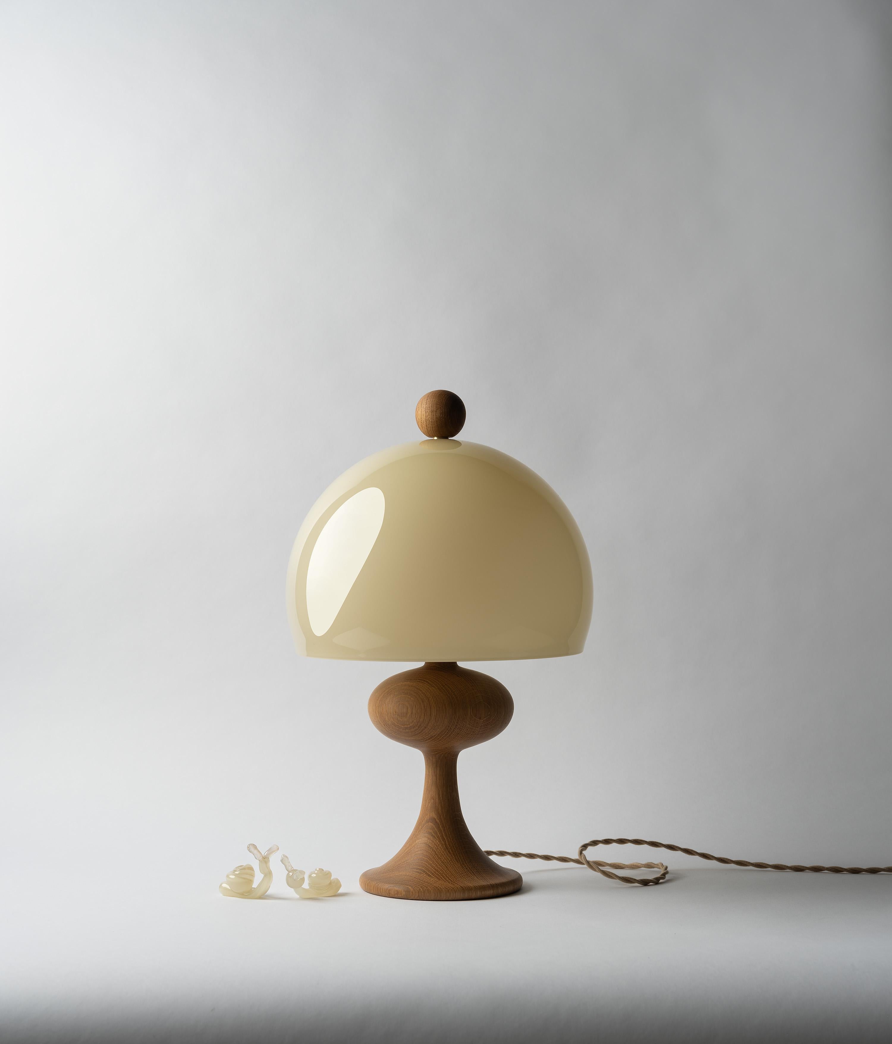 Named after traditional turned-wood bobbin lamps—but a little fancier—Bobine is a playful, pretty table lamp available with either a wood or glass base and a glass shade. The finial sits on the shade like a pompom on a beanie cap and is matched to the base. Bobine can be purchased with either one or two glass snails to the side, because of course your lamp needs a snail or two to keep it company! All the parts and pieces of Bobine are hand-made by artisans in Portland, Oregon. Each lamp is a special work of art.